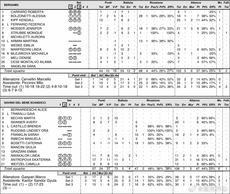 贝加莫球员基普12分(25扣11中1失误2被拦1拦)曼弗雷迪尼8分(10扣6中1失误2拦)博尔扎内蒂7分(18扣7中1失误)莫瑟尔7分(21扣6中1失误3被拦1拦)塞斯4分(7扣4中)梅里3分(3扣2中1发)斯塔比2分(4扣1中1拦)卡拉洛1分(4扣1中1失误)