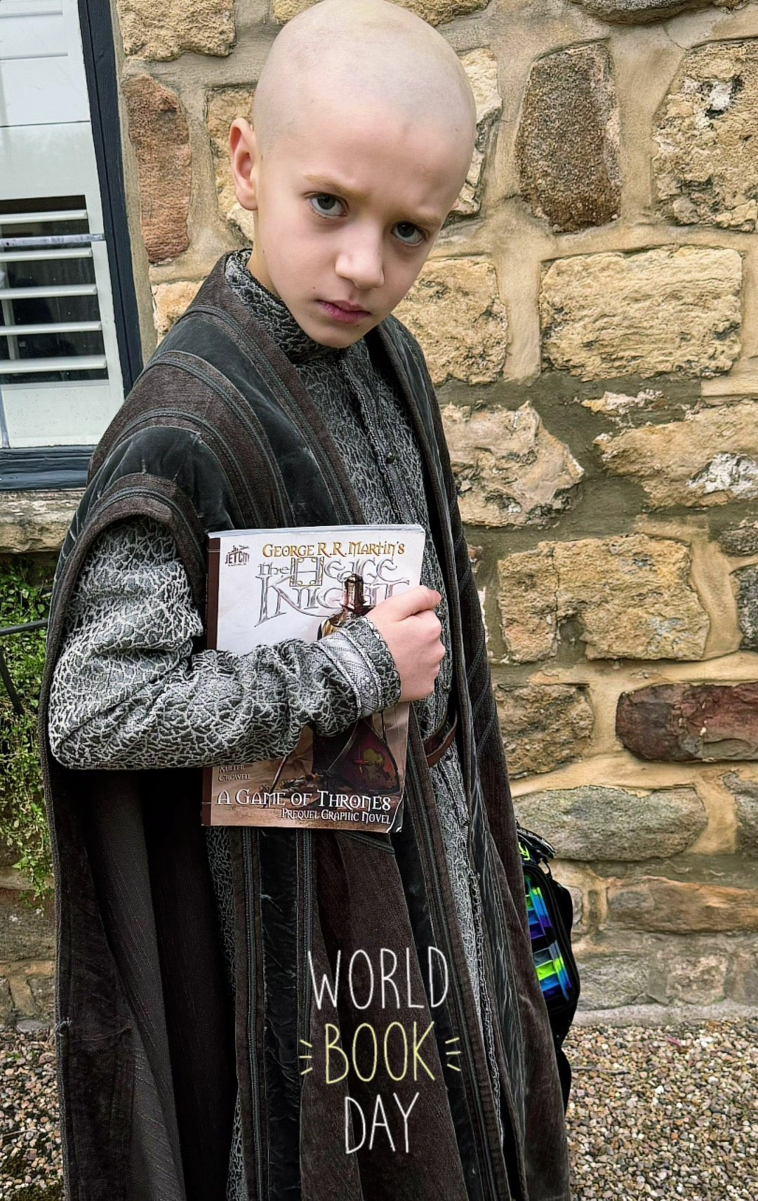 《七王国的骑士》主演德克斯特·索尔·安塞尔在学校“世界读书日”活动中,把自己打扮成了剧中的角色“伊戈”。