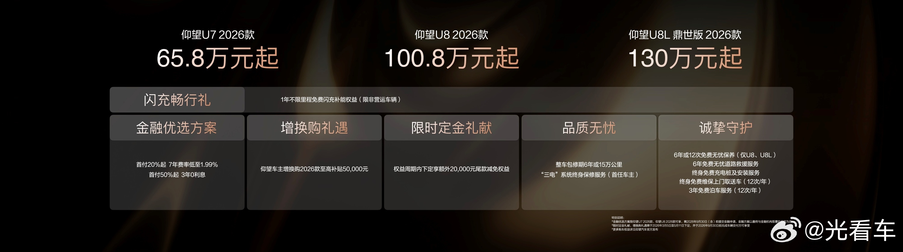 此外,仰望汽车还推出了闪充畅行礼遇,2026年5月11日(含)前支付2026款仰望车型定金的用户,自交付之日起,可享受一年内在比亚迪闪充充电桩免费充电权益(限非营运车主)。仰望U7 2026款:闪充赋能人生掌控感,畅享极致驾趣仰望U7 2026款在四电机强劲动力基础上实现续航、充电速度的双重提升,一举打破了传统上性能、续航、快充难以兼顾的“不可能三角”,以第二代刀片电池及闪充技术赋能人生掌控感。新车延续了远超同级旗舰轿车的超强动力,首搭全新升级的第二代刀片电池,EV版电池容量增至150.01kWh,CLTC纯电续航提升至1006km,PHEV版综合续航达1100km。在闪充技术加持下,可实现“5分钟充好、9分钟充饱、零下30度只多3分钟”的极致快充体验,让每一次出行都更加高效从容。无论周末跑山、海边兜风,U7都能让您尽情挥洒激情,享受极致驾趣。全球首款电悬架云辇-Z能够满足驾驶爱好者对于操控的无尽想象。同时,新车首次搭载云辇-A+智能空气车身控制系统,双腔双阀,操控在线,舒适拉满,满足了用户的多元化需求。无论是寻求升级的新能源用户,还是期待颠覆体验的传统豪华车用户,仰望U7 2026款都是体验极致新能源旗舰的不二之选,掌控人生的同行伙伴。为彰显个性化独特品味,新车提供6种外观颜色和4种内饰颜色,供用户自由选择搭配。仰望U8 2026款:极致性能再进化,拓宽人生疆域历经三年市场磨砺与用户共创,仰望U8已成为无数越野人的“梦中情车”。仰望U8 2026款在极限征服能力与全场景适应性上全面进阶,搭载基于易四方优化升级控制模式算法的eTCS2.0技术,扭矩控制更精准及时,帮助车辆实现全速域、全地形的智能动态控制,进一步提升行驶稳定性与安全性。全新搭载的云辇-P+系统升级双阀液压减震器,可显著化解路面冲击和颠簸,无论是穿越无人区还是长途跋涉,都能提供卓越的越野性能和舒适体验。闪充技术为仰望U8 2026款带来续航与补能的双重革命,综合续航提升20.5%,达到1205km,充电倍率提升3倍,达到9C,大幅缩短补能时间,让极致探索更加从容无忧。此外,新车集成最新一代智能生态,搭载全球领先的3nm 5G车机芯片和天神之眼5.0系统,标配全新智能驾驶辅助指示灯,打造更安全、更智能的用车体验。仰望U8L鼎世版 2026款:“总裁严选”座驾,筑牢“鼎”级安全仰望U8L鼎世版 2026款同样提升了续航、搭载闪充技术,并在整车安全上再次升级。新车配备了全新的全场景隐私安全功能,不管是出行行程,还是个人数据,隐私保护的安全锁进一步加固,实现用车数据安全、隐私无忧。同时,仰望首创的高速爆胎稳行能力进一步扩展,通过与天神之眼系统相融合,带来了NOA爆胎稳行稳停功能,为辅助驾驶安全打造更强防线。另外,应急浮水功能从手动开启升级到自动开启,为生命安全争取最宝贵的时间。这三项安全升级,老客户也将通过OTA升级实现。上市以来,U8L收获众多企业家用户青睐,连续交付美的集团董事长方洪波、慕思集团董事长王炳坤、九牧集团董事长林孝发等中国领军企业家,成为名副其实的“总裁严选”座驾。U8L鼎世版 2026款以“鼎级”技术诠释“鼎级”行政豪华的全新内涵,加上“鼎快”的闪充,让每一位改变世界的同行者,都能在路上掌控全局,从容前行。从U7畅享极致驾趣,到U8拓宽人生疆域,再到U8L构筑鼎级安全,仰望2026款旗舰矩阵覆盖了运动豪华、硬派越野、行政豪华三大场景。仰望加闪充,三款新车的联袂登场,是“超越极致,前所未有”品牌精神的最新注脚。仰望始终相信,极致技术不应是冰冷的参数,而应是赋能用户创造价值、革新体验的力量。未来,仰望将继续以颠覆性技术创新为驱动,坚持在这条难而正确的道路上,与所有同行者一道,创造历史,改变世界。