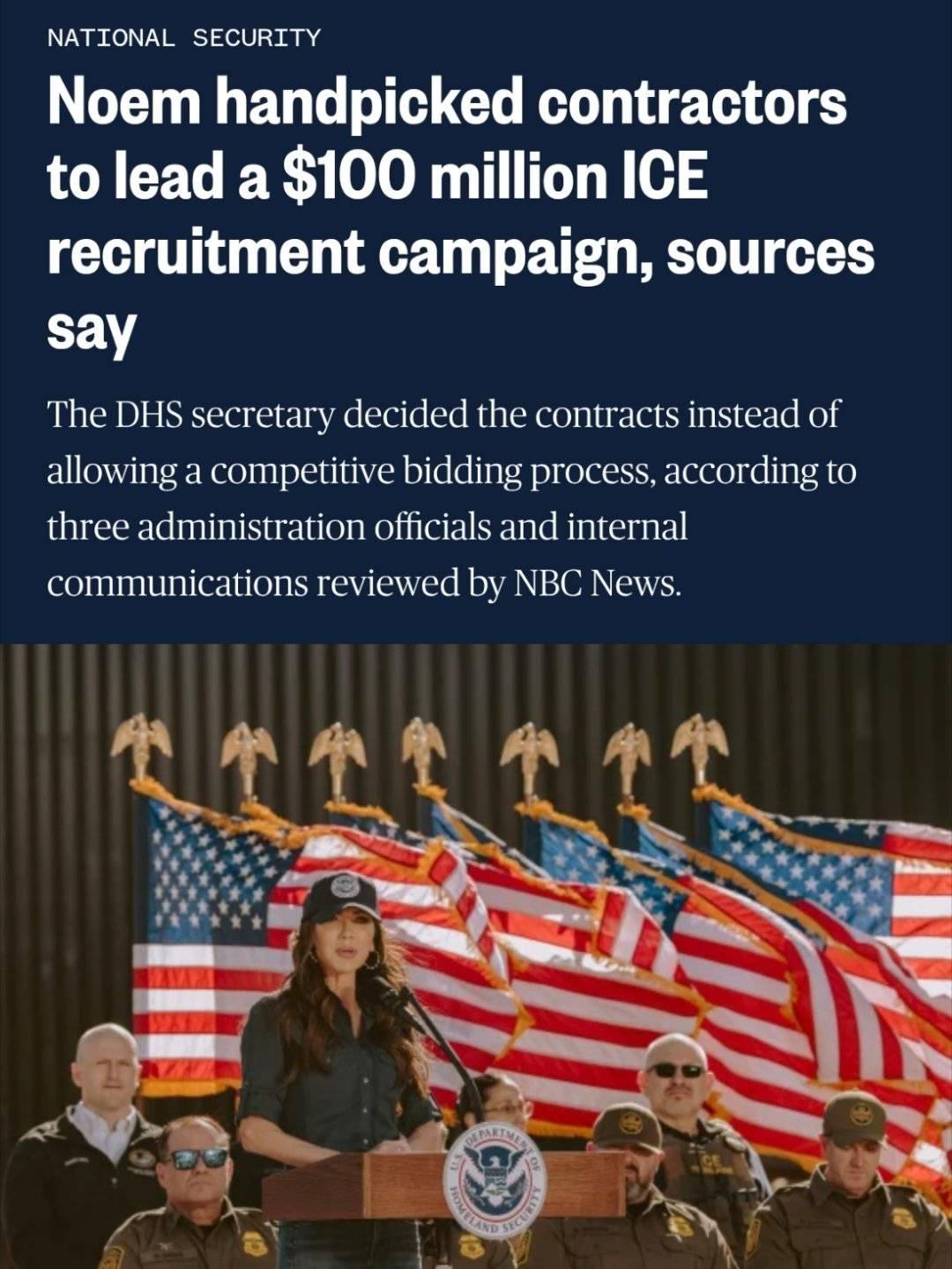 美国国土安全部长贪得无厌又无能被川总解职。特朗普解职国土安全部长诺姆,这是他第二任期首次内阁换人。 解职直接导火索: 国会听证崩盘,本周在两院司法委员会作证,表现“灾难性”,两党强烈不满。 明尼苏达枪击事件,国土安全部执法人员打死2名美国公民,诺姆说法前后矛盾。 民主党威胁弹劾,要求辞职,否则启动弹劾程序。 内部矛盾:特朗普对其移民执法、部门管理长期不满。 她的国土安全部拍了一个2.2亿美元的广告片,她亲自出演。其中1.43亿美元流向一家成立11天的皮包公司,与她有直接利益联系。她在听证会上却拿川总当挡箭牌。 川总很不开心,已经选了一个格斗手出身的莽汉参议员穆林接任。穆林是参议院唯一美国原住民议员,强硬派, 支持特朗普移民政策;提名需参议院确认(共和党占优)3月31日生效。 诺姆新职:美洲之盾特使,负责西半球安全新倡议(3月7日佛罗里达宣布)。