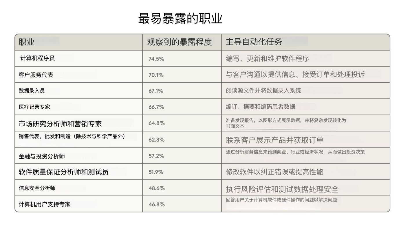 最容易受影响的十大职业:- 计算机程序员- 客户服务代表- 数据录入员- 医疗记录专家- 市场研究分析师和营销专家- 销售代表,批发和制造(除技术与科学产品外)- 金融与投资分析师- 软件质量保证分析师和测试员- 信息安全分析师- 计算机用户支持专家