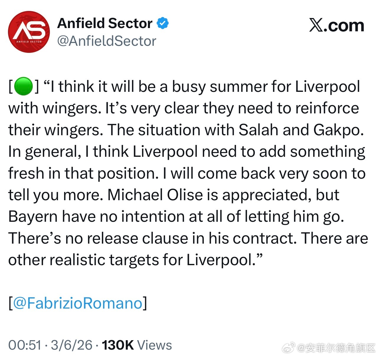 罗马诺说我军夏窗在边锋这个位置上会很忙碌,现在的情况也很明显了利物浦需要补强边锋。萨拉赫和加克波那里利物浦需要在这边锋位置上增加一些新鲜血液。他在之后发布更多的利物浦关于边锋的信息,利物浦很欣赏奥利塞但拜仁无意放他离开,球员的合同中也没有解约条款,利物浦那边有更实际的边锋目标人选。