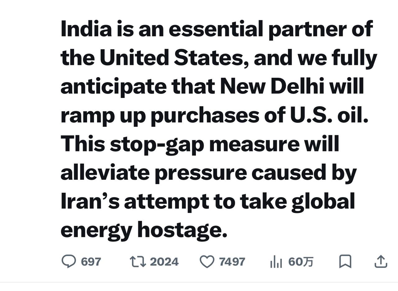 印度是美国的重要伙伴,我们完全预期新德里将增加美国石油的购买量。这项权宜之计将缓解伊朗企图挟持全球能源所造成的压力。”