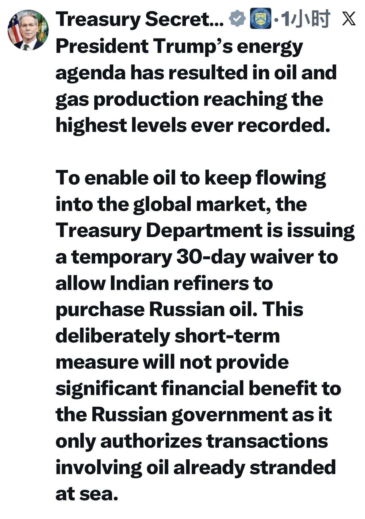 为了确保石油持续流入全球市场,美国财政部发布了一项为期30天的临时豁免令,允许印度炼油商购买俄罗斯石油。这项刻意为短期的措施不会给俄罗斯政府带来显著的经济利益,因为它仅授权涉及已滞留在海上的石油的交易。