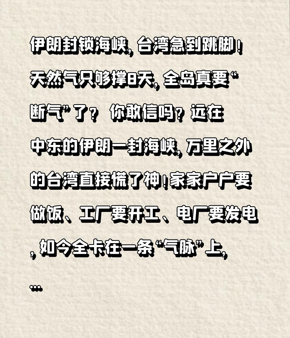 伊朗封锁海峡,台湾急到跳脚!天然气只够撑8天,全岛真要“断气”了? 你敢信吗?远在中东的伊朗一封海峡,万里之外的台湾直接慌了神!家家户户要做饭、工厂要开工、电厂要发电,如今全卡在一条“气脉”上,再没对策,用不了多久,台湾就要陷入无气可用、停电限供的困境! 很多人觉得,中东打仗跟台湾八竿子打不着,这就大错特错了!台湾能源自给率不足5%,石油99%靠进口,天然气98%靠进口,堪称“能源孤岛”。其中30%的天然气来自卡塔尔,78%的原油来自中东国家,这些能源船,必须经过霍尔木兹海峡才能到台湾。 现在伊朗放出狠话,控制海峡通行,油轮气轮不敢走、不能走,等于直接掐断台湾的能源大动脉!本来以为只是油价涨一点,没想到是源头直接断供,这谁顶得住? 更扎心的转折点来了:台湾天然气储备只够撑8-11天,远低于国际安全标准!岛内近一半电力靠天然气发电,医院、交通、芯片厂,全都离不开稳定供电。台当局还在嘴硬说“有备援”,可储罐就那么大,想多囤都囤不下,卡塔尔气源一停,再有钱也买不到急货。 短短几天,岛内舆论炸锅,民众担心洗澡没热水、做饭没燃气,商户怕停电停业,连台积电都面临停产风险。原本隔岸观火的台湾,一夜之间成了全球能源危机里最脆弱的一环,这就是盲目依赖外部能源的代价! 说到底,台湾的安稳从来不是靠嘴硬,更不是靠远水救近火。只有背靠祖国大陆,拥有稳定可靠的能源与供应链,才能真正不怕国际风浪。别等到真的断气停电,才明白什么是血脉相连、安全相依。 同根同源,安危与共,只有回家,才有永远不断的“底气”!
