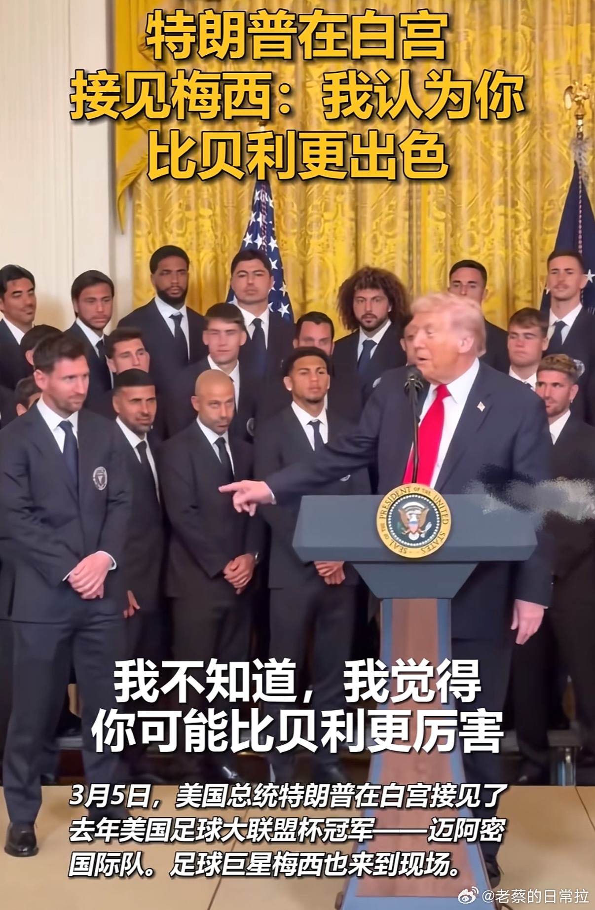 特朗普在白宫接见梅西 当地时间3月5日,特朗普在白宫接见美职联冠军迈阿密国际,梅西首次亮相白宫。特朗普盛赞梅西“比贝利更出色”,还称儿子是其铁杆球迷。发言频频跑题,球员成背景板。球队赠47号球衣,梅西送签名足球。