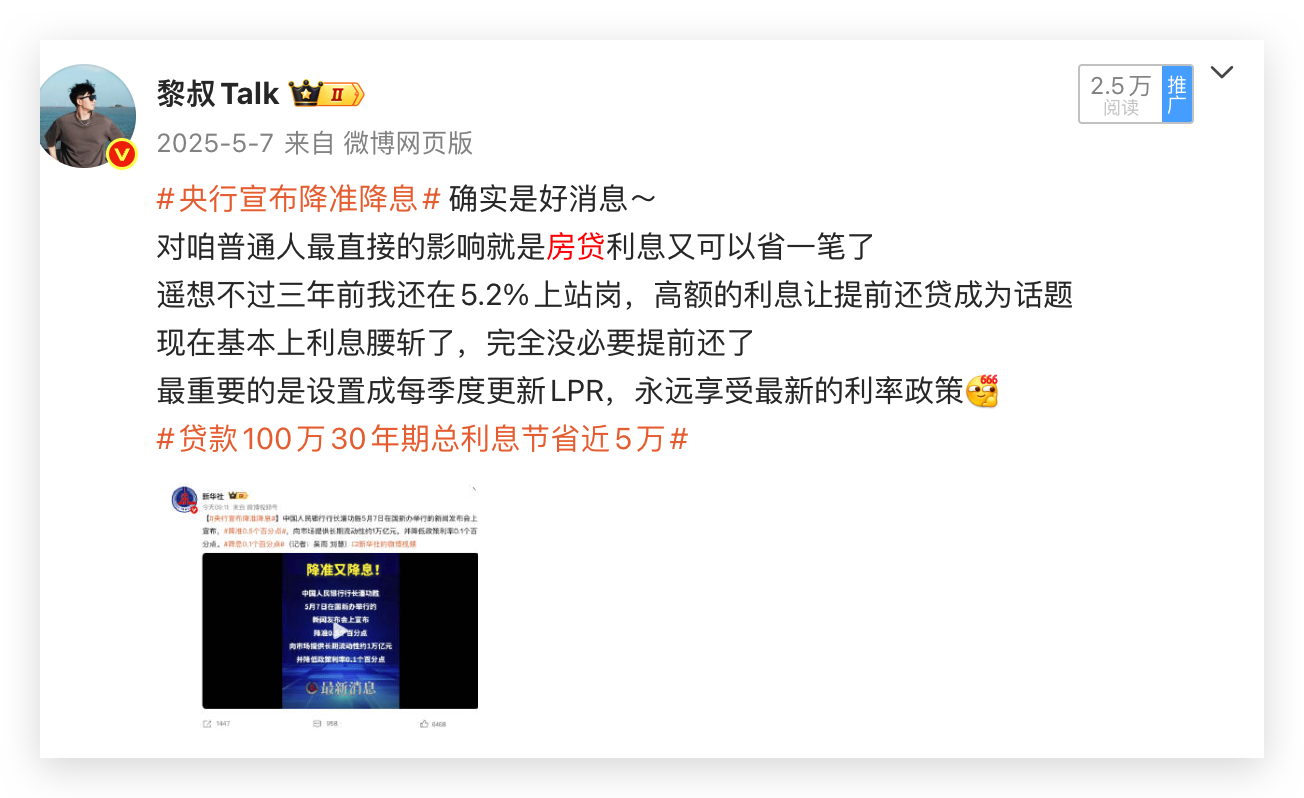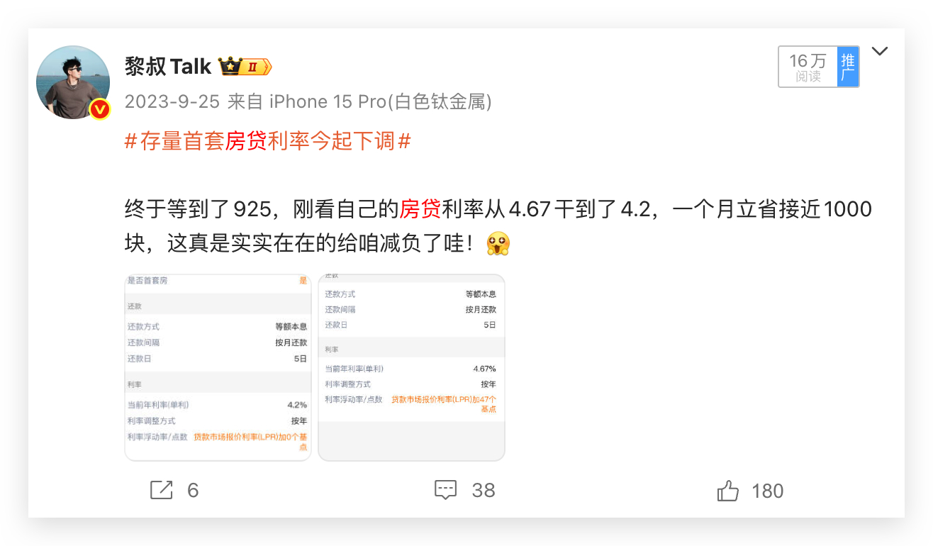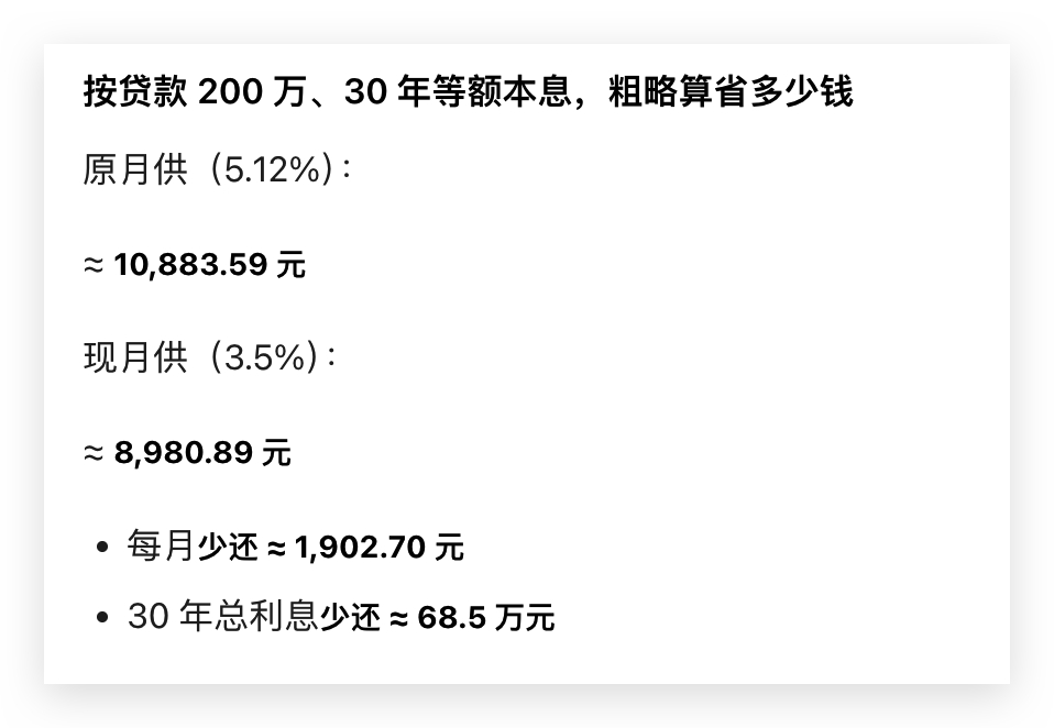 利率下调房贷省出110万元 有一说一,利率下调对于房贷确实省了不少钱从2023年到现在,从5.2%站岗到现在3.5%按贷款200万、30年等额本息,月供从10883降到8980每个月实打实少还1900块钱,三十年利息省了68万这么一算的话,今年又可以多买两辆车了