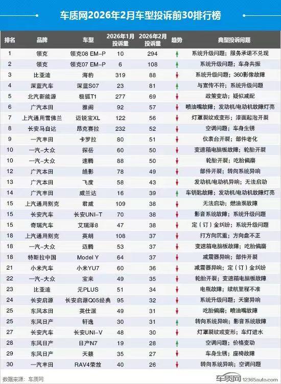 2月车型投诉排行榜出炉,一起俩看看吧! 第一名、领克 08 EM-P:294 起;核心为系统升级受限、服务承诺不兑现; 第二名、领克 07 EM-P:108 起;集中在系统升级问题、车身共振; 第三名、比亚迪海豹:88 起;投诉焦点是承诺的哨兵模式 OTA 长期未推送、360影像故障; 第四名、深蓝S07:81起,投诉问题为与宣传不符,系统升级问题; 第五名、极狐T1:69起,投诉问题政策变动,疑似减配; 第六名、广汽本田雅阁:57 起;喷油嘴故障、发动机/电动机故障灯亮; 第七名、雪佛兰迈锐宝 XL:56起;灯罩裂纹 / 变形、漆面起泡开裂; 第八名、长安马自达 3 昂克赛拉:52 起;空调问题、车身局部生锈; 第九名、卡罗拉:51起,主要投诉问题为仪表台开裂、部件老化; 第十名、探岳:50起,主要投诉问题为变速箱电脑版故障,轮胎开裂。 点评: 第一、新能源车型投诉多聚焦服务 / 系统升级而非传统三电硬件故障; 第二、春节假期后投诉总量环比下降,但领克、深蓝等部分车型投诉逆势大增; 第三、合资燃油车仍以变速箱、发动机、轮胎等机械质量问题为主。【来自懂车帝车友圈】
