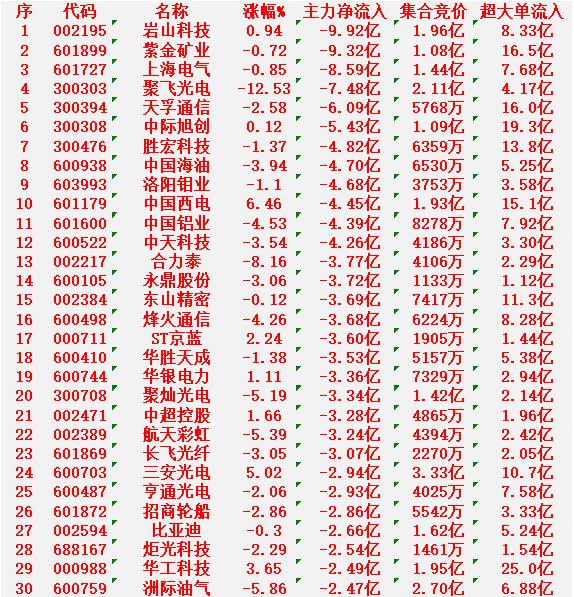 3月6日上午盘,主力趁低位,大幅买入的30名单 协鑫集成:涨幅 +10.10%,净流入 11.5亿元 宗申动力:涨幅 +9.99%,净流入 11.1亿元 中国能建:涨幅 +9.89%,净流入 10.9亿元 香农芯创:涨幅 +10.73%,净流入 7.82亿元 联特科技:涨幅 +20.00%,净流入 5.12亿元 3月6日中午收盘,主力资金“大幅卖出”的30名单: 岩山科技:涨幅 +0.94%,净流入 -9.92亿元 紫金矿业:涨幅 -0.72%,净流入 -9.32亿元 上海电气:涨幅 -0.85%,净流入 -8.59亿元 聚飞光电:涨幅 -12.53%,净流入 -7.48亿元 天孚通信:涨幅 -2.58%,净流入 -6.09亿元