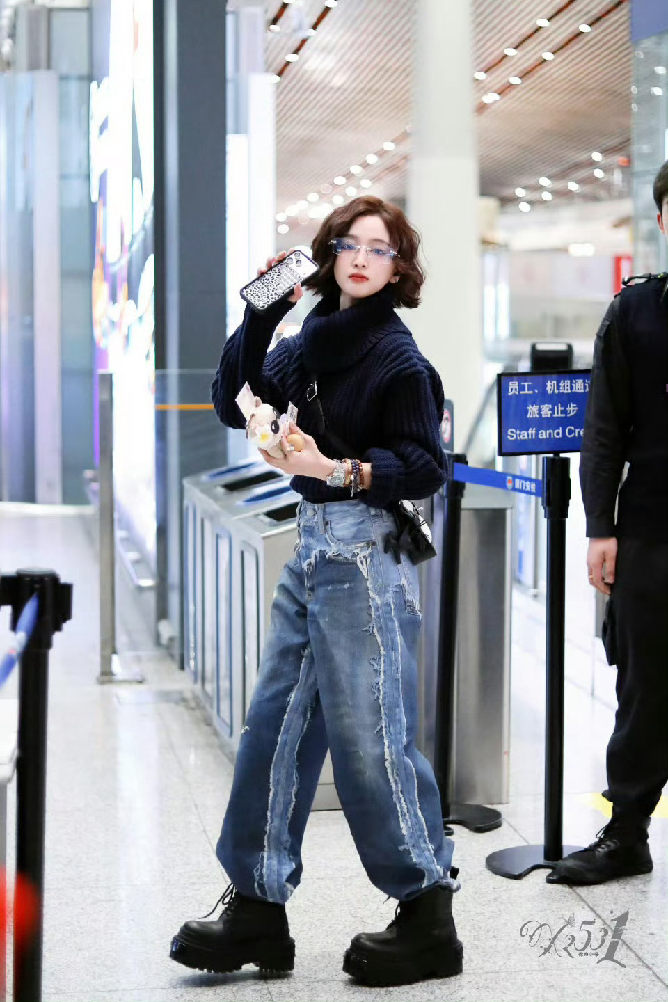 短发造型真的太惊艳了!深蓝色粗针织毛衣配浅色牛仔裤,简约又有个性。短发衬得她五官