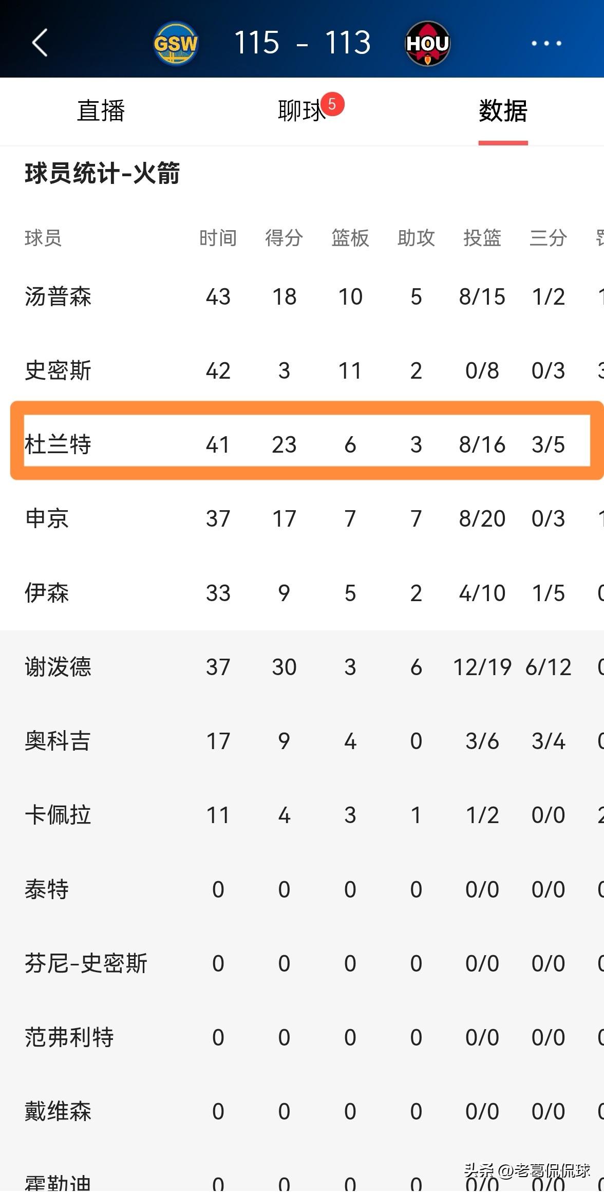 我忍不住怒批火箭巨星杜兰特!在今天火箭主场以113:115不敌勇士的比赛中,杜兰特竟然在加时赛的最后时刻罚丟了两记非常关键的罚球,导致球队最终与胜利擦肩而过。 整场比赛下来,杜兰特首发出战41分钟,投篮16中8,其中三分球5中3、罚球6中4得到23分,还有6篮板3助攻4抢断1盖帽,出现了3次失误,他的场上正负值为-5。 实事求是的说,如今杜兰特的关键球能力真的很一般,杜兰特竟然眼睁睁的看着球队输给了残阵勇士。