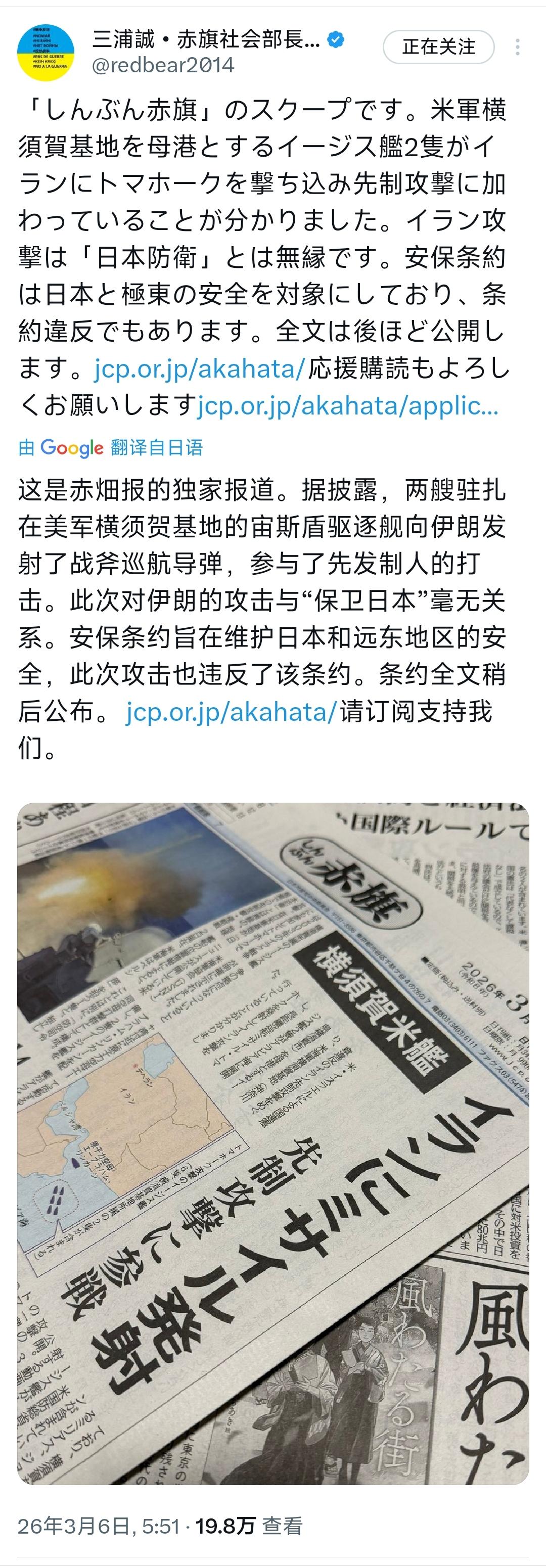 日本共产党中央机关报《赤旗报》今天(3月6日)独家消息:据悉,以美军横须贺基地为母港的两艘宙斯盾舰发射战斧导弹袭击伊朗,参与了此次先发制人打击。对伊朗的攻击与“日本防卫”毫无关联,日美安保条约的适用对象为日本及远东地区的安全,美方此举同时也违反了该条约。 [机智]评几句:美军驻日基地就是法外之地。西班牙可以拒绝美军利用其基地实施对伊朗的军事行动,日本能够拒绝吗?答案显然是否定的。美军竟以驻日横须贺基地为母港,出动宙斯盾舰发射战斧导弹袭击伊朗,这场与日本防卫毫无关联的军事行动,公然违反了日美安保条约仅适用于日本安全的规定。西班牙能凭主权和欧盟后盾对美国说不,日本却沦为美军肆意用兵的跳板,连基地使用权的基本话语权都丧失。美方的违条约行径,日方的沉默纵容,让驻日美军基地彻底成为美国践踏规则、搅乱中东的霸权工具,也暴露了日本在日美同盟中毫无主权可言的附庸本质。