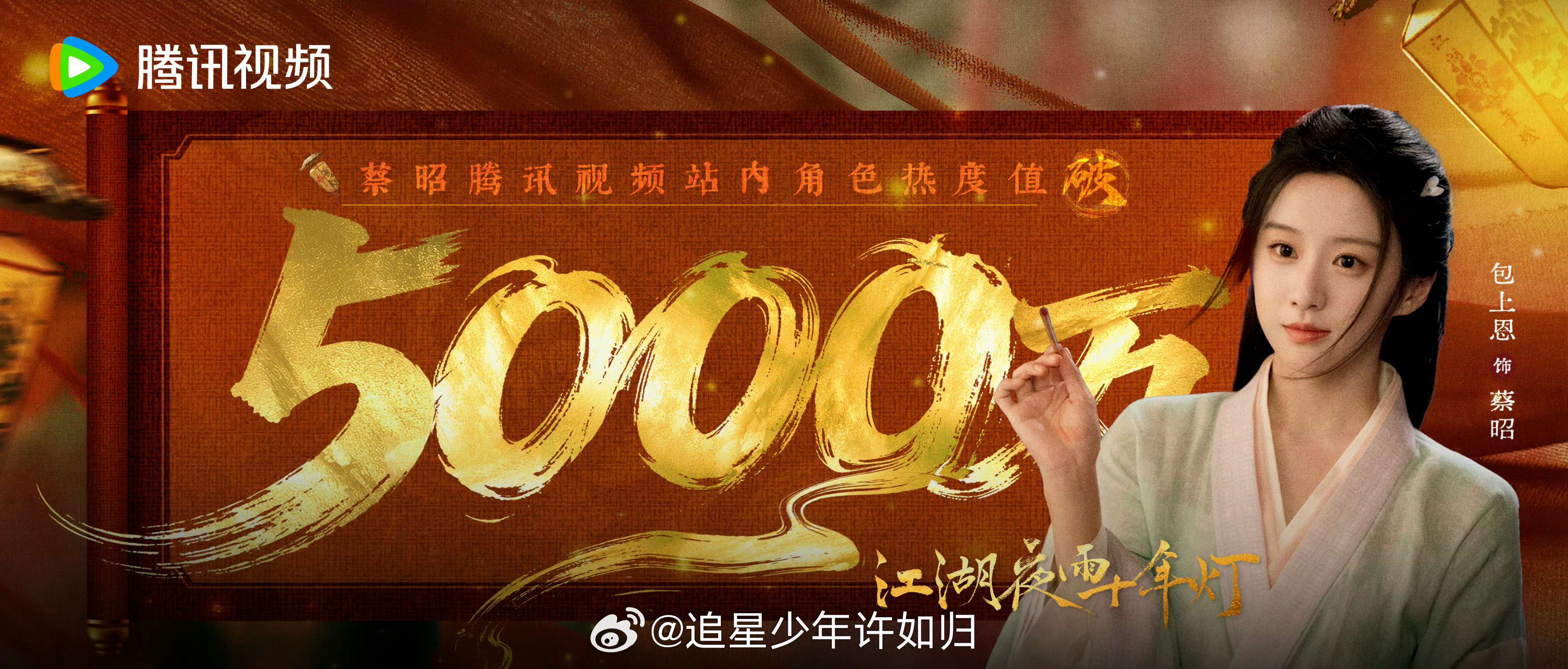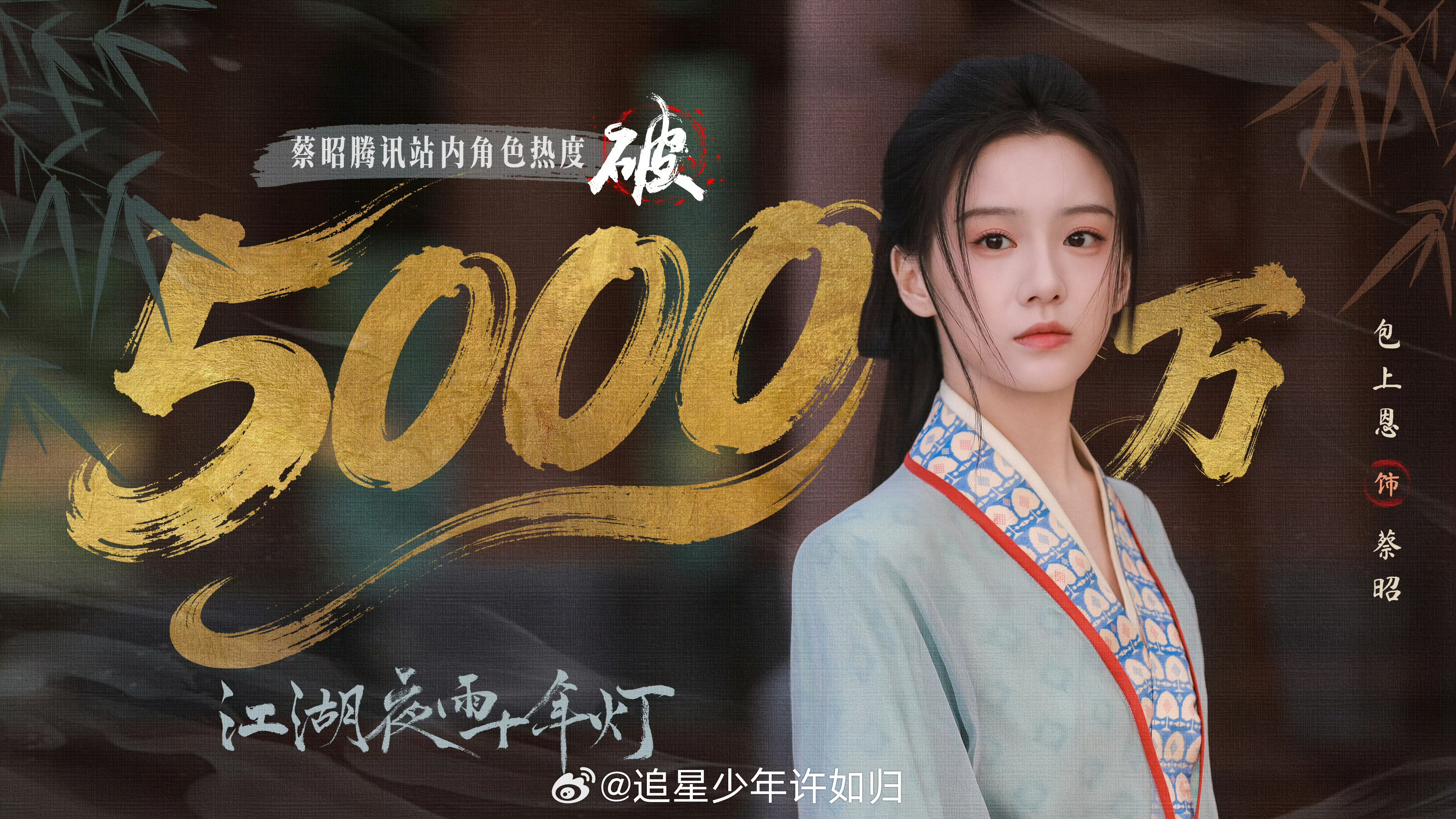 包上恩蔡昭角色热度破5000万 沃趣!包上恩是00花第2位解锁成就的!粉丝两个月