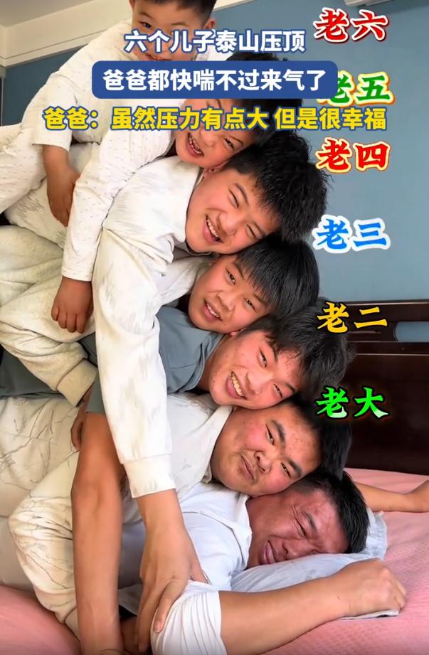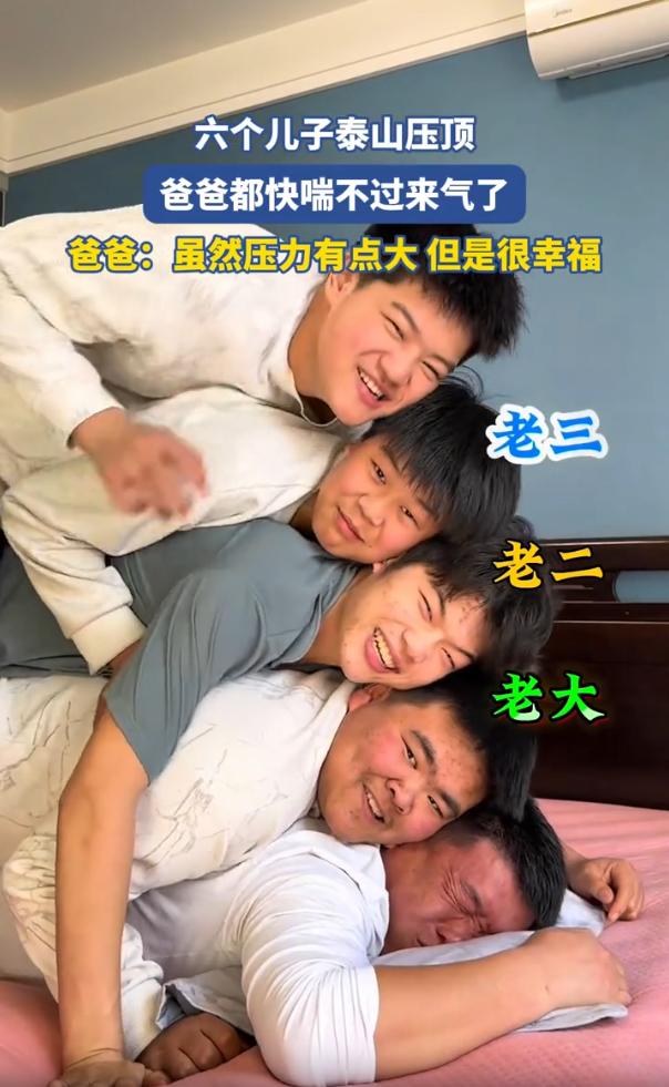 压力山大!河北,一位父亲趴在床上,让儿子爬到自己的身上叠罗汉,不过不是一个儿子,而是六个儿子,当最后的小儿子叠上来时,父亲在下面脸都快憋红了。网友:这压力确实够大! 能看得出来,虽然父子几人体型存在差异,有胖有瘦,但长得几乎是一个模子刻出来的,大儿子上去,父亲还能笑呵呵;二儿子上去,笑容还挂在脸上;等到老三压上来,这位父亲的表情开始微妙起来;老四一上,明显能看出他在咬牙坚持;老五老六再接再厉,最后那位父亲的脸已经憋得通红,青筋都暴起来了 要不是二儿子用手臂撑着分担了点重量,这场面估计撑不到最后。这位父亲事后说了一句话:压力是有点大,但觉得很幸福 看到这场景,脑子里蹦出来的第一个念头是:这位父亲年轻时得扛起多少事啊 六个儿子,不是六个玩具,不是养大了就完事。小时候要喂饱六张嘴,长大了要操心六个人的婚事,成家了还要惦记六家的日子。这哪是叠罗汉那几分钟的压力,这是几十年的压力 但你看他的表情变化,从轻松到吃力,从吃力到硬撑,从硬撑到最后的倔强。这过程像极了一个父亲的真实写照:明知道扛着费劲,但孩子们想来,他就趴那儿了 这种压力,确实够大。但这种幸福,也确实够真。一个家庭能有这样的画面,比什么豪宅名车都金贵 六个儿子泰山压顶 爸爸快喘不过气