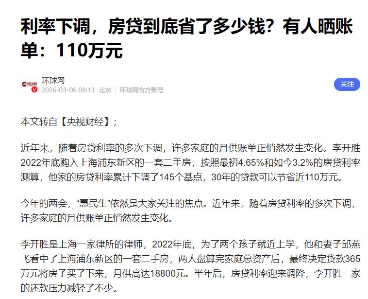 房贷利率一降再降,月供真少了!有人30年省110万,账算得明明白白 今年全国两会,大家最关心的还是惠民生的事,而房子这事,直接关系到每个家庭的钱袋子,更是重中之重。 这几年,房贷利率一降再降,有房贷的家庭都能明显感觉到,每个月要还的钱变少了。就说上海一位市民,算下来30年能省近110万,这笔账,咱们今天就掰扯明白。 房子是每个家庭的大事,房贷更是很多人一辈子最大的开销,利率稍微动一动,每个月还的钱就差不少。 2022年底,上海的李开胜为了让两个孩子就近上学,和妻子在浦东买了套二手房,凑完钱后,贷了365万,分30年还,每个月还一样多的钱(等额本息)。当时利率是4.65%,每个月要还18820元,压力真不小。 对普通家庭来说,一个月近1.9万的房贷,几乎占了家庭收入的一大半。还完房贷,剩下的钱要养孩子、养老人、顾日常开销,每一分都得省着花,日子过得紧巴巴。 李开胜说,刚买房那会,手里没多少积蓄,每个月还完房贷,连随便花钱都不敢,更别提有什么额外计划了。 从2023年开始,国家为了减轻大家的房贷压力,一次次出台政策,房贷利率一降再降。 到现在,李开胜家的利率从4.65%降到了3.2%,一共降了1.45个百分点(很多人不懂基点,其实1个基点就是0.01%,145个基点就是降了1.45%),别小看这一点,30年下来,能省一大笔钱。 咱们算笔实在账,利率4.65%时,每个月还18820元;降到3.2%后,每个月还不到16000元,一个月能省近2800元。 一年下来就是3.6万多,30年累计下来,居然能省近110万!这可不是虚数,是实实在在少还的利息。 不光李开胜家,全国所有符合条件的房贷家庭都能享受到这个福利。而且不用大家跑银行、交材料,银行会自动调整利率、更新月供,省时又省力。 不管是商贷还是公积金贷款,利率都降了,公积金贷款更划算,5年以上首套利率已经降到2.6%,还款压力又小了一截。 不同家庭省的钱不一样,贷款越多、年限越长,省得就越多。比如贷100万30年,利率降1个百分点,就能省几十万;贷200万30年,能省60万以上,这些都是实打实的优惠。 今年两会也说了,要好好做好惠民生的事,解决大家的难处,住房就是关键。房贷利率持续下调,就是国家给老百姓的实惠,让大家买得起房、还得起贷。 现在房贷利率已经是历史低位,后续还会根据大家的需求优化政策,相信以后大家的房贷压力会更小,日子也会过得更宽裕、更舒心。