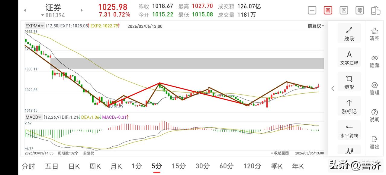 聊聊证券板块(2026.3.6) 今天证券板块的走势是符合昨天的预判的,冲破了昨天的高点,打开了后面几天进一步向上攀升的空间,那么在操作上只需耐心持股待涨即可,并不需要去频繁操作。 1.从30分钟图一上看,今天破了昨天的高点,下午又是一个震荡回踩的过程,但幅度并不大,此处做差价是没有意义的,所以只需持股观察即可。 2.从5分钟图二上看,昨天走了一个ABC,那么今天又会走一个向上ABC和向下ABC的回踩,从而构建一个30分钟的上涨中枢,然后再继续向上攀升,所以此处更多的机会而非风险,走势无忧。 3.从三大指数和各主流板块上看,都处在逐步向上抬升的过程中,盘面走势良好,并无大的风险,可考虑短线积极做多。天南地北大拜年 证券板块解析