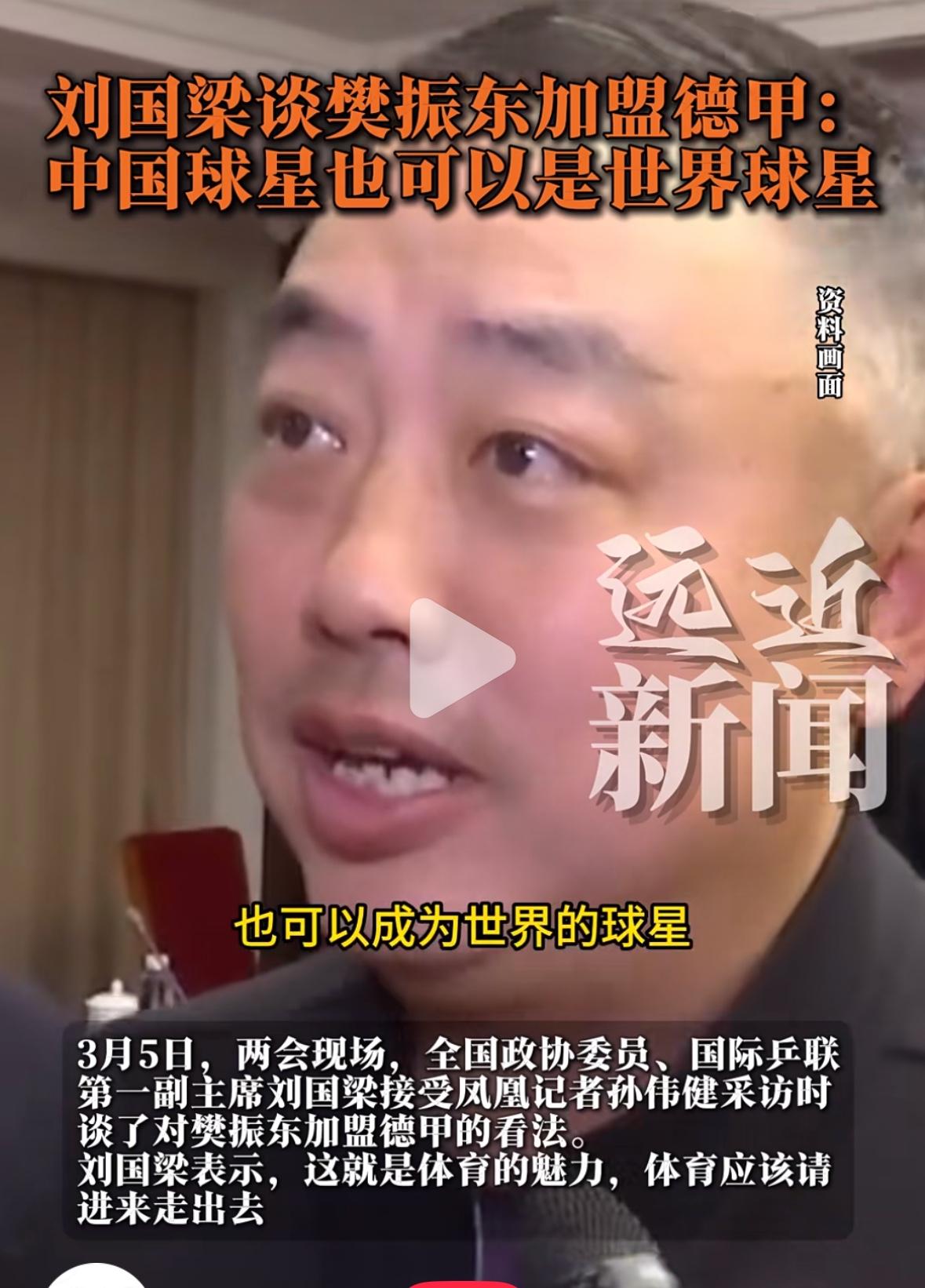 刘国梁首次谈樊振东加盟德甲:我们的球星也是世界的球星,值得我们学习,这是最好的体育软实力交流! 3月5日,全国政协委员刘国梁首次 谈樊振东加盟德甲: “樊振东做的很好👍, 我们的球星也可以是世界的球星, 我觉得他做的很好👍, 特别是作为一名优秀的球员, 他勇于尝试走出这一步, 我觉得很值得大家学习, 因为体育无国界, 你只要打的好, 这就是体育的魅力, 体育就应该请进来,走出去, 樊振东在完成大满贯或 完成职业生涯阶段性胜利后, 勇于尝试走出这一步, 很值得大家学习, 只要打的好, 这才是最好的体育软实力交流!” 刘国梁表示, 奥运会后, 都会有战略性的运动员调整, 优秀运动员休息调整, 新的小将冲上来, 最重要的是奥运年, 把国乒运动员的状态调整到最佳, 四年一个周期, 这也是考验教练组调整运动员 比赛状态的变化能力! 刘国梁首次谈樊振东加盟德甲, 肯定了樊振东是软实力交流, 体育就应该请进来,走出去!
