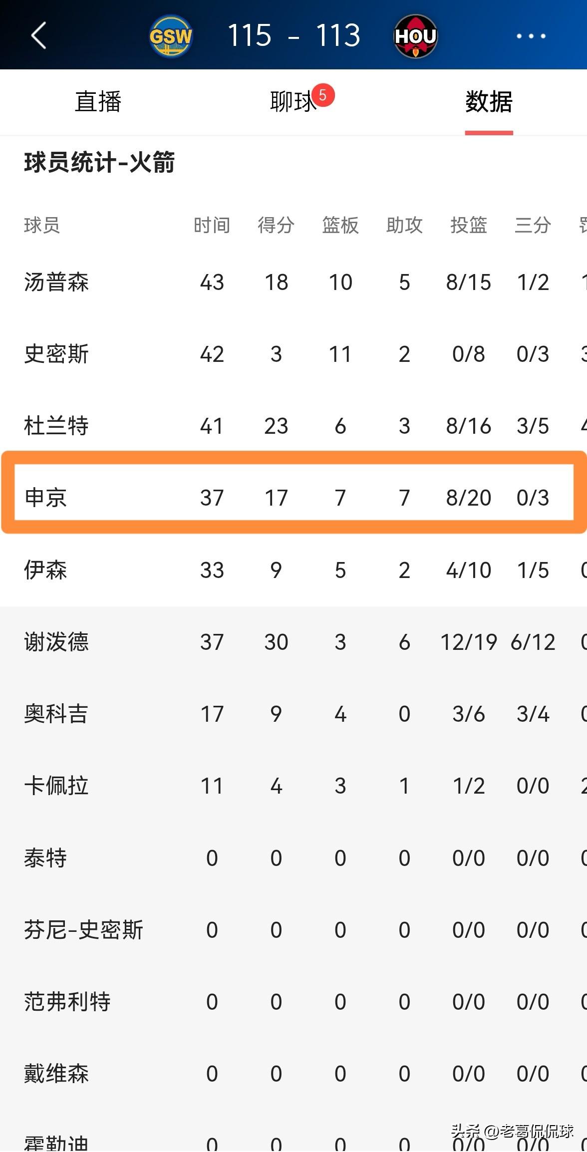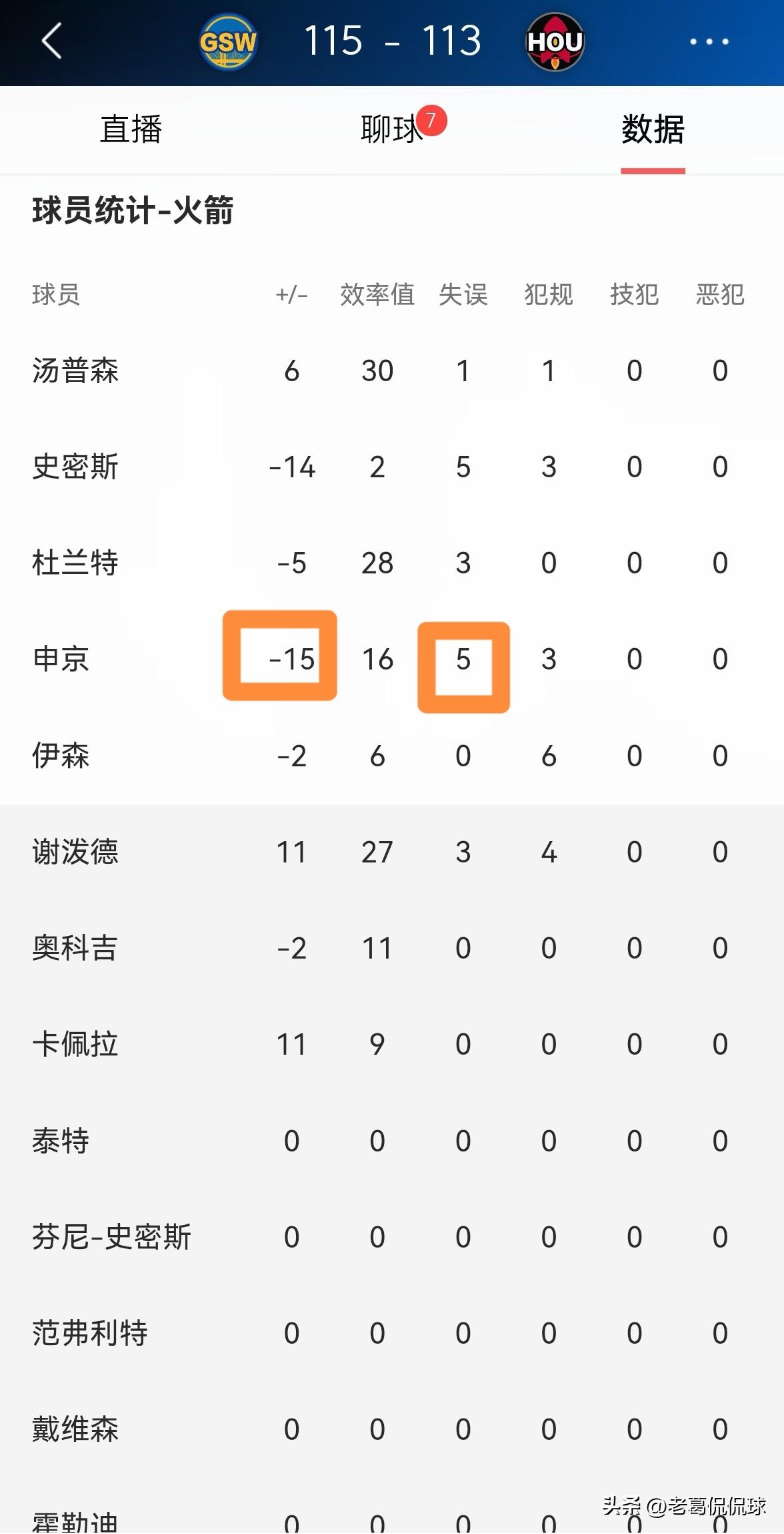 火箭超级中锋申京真是球队的罪魁祸首!今天火箭在主场以113:115爆冷不敌残阵勇士,其中申京的表现简直就是一场灾难,申京堪称球队失利的罪魁祸首。 整场比赛下来,申京首发出战37分钟,投篮20中8,其中三分球3中0、罚球1中1得到17分,还有5次失误和3次犯规,他的场上正负值为全队最低的-15。 我相信当火箭的主场球迷亲眼目睹申京的糟糕表现后,他们一定会对申京大失所望。