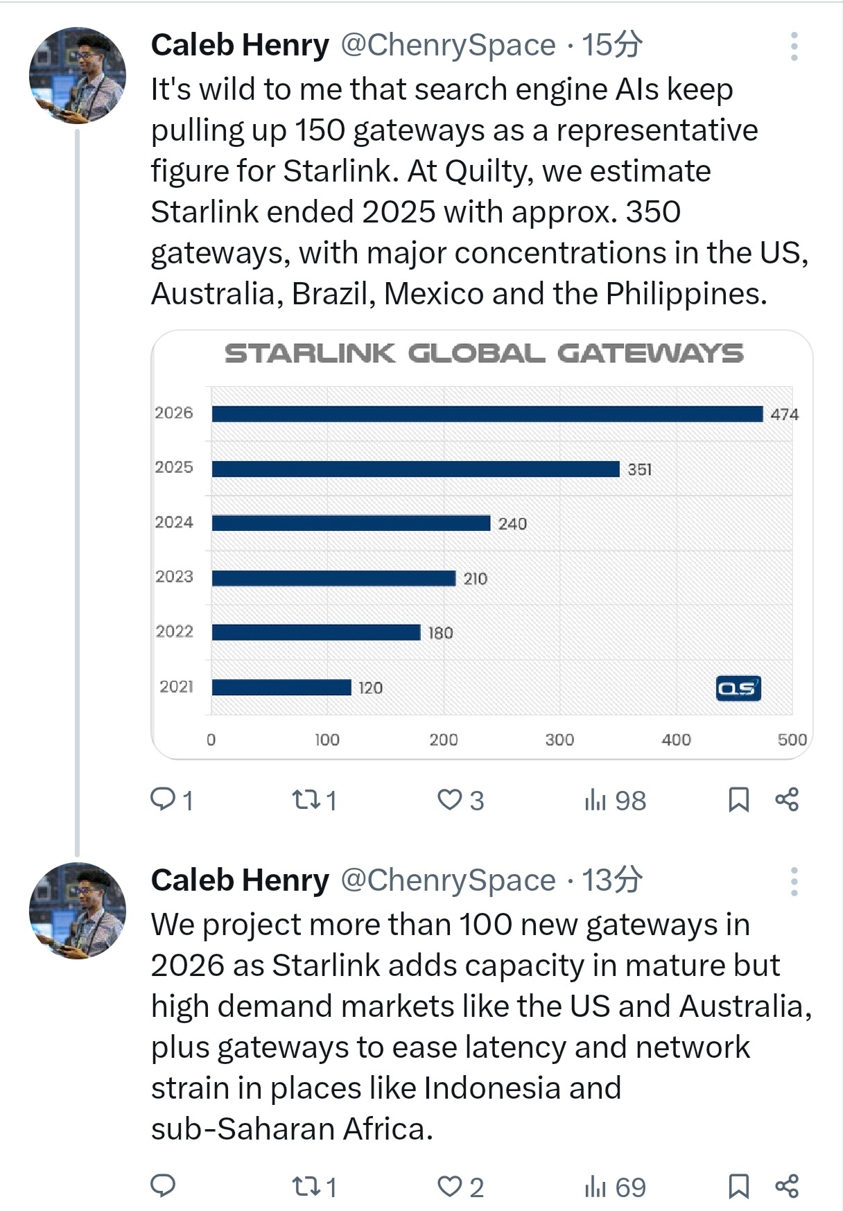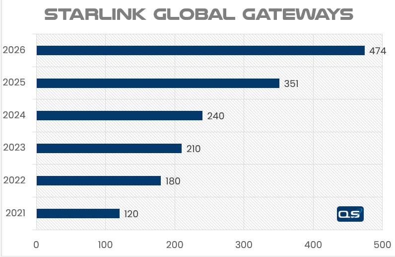 知名行业咨询机构Quilty Space的Caleb Henry在推文中指出,Starlink在2025年底已拥有约350个地面信关站,主要集中在美国、澳大利亚、巴西、墨西哥和菲律宾;预计2026年将新增超过100个信关站,使总数达到474个,新增站点将用于在美国、澳大利亚等成熟但高需求市场增加容量,并在印度尼西亚、撒哈拉以南非洲等地部署以降低延迟、缓解网络压力。