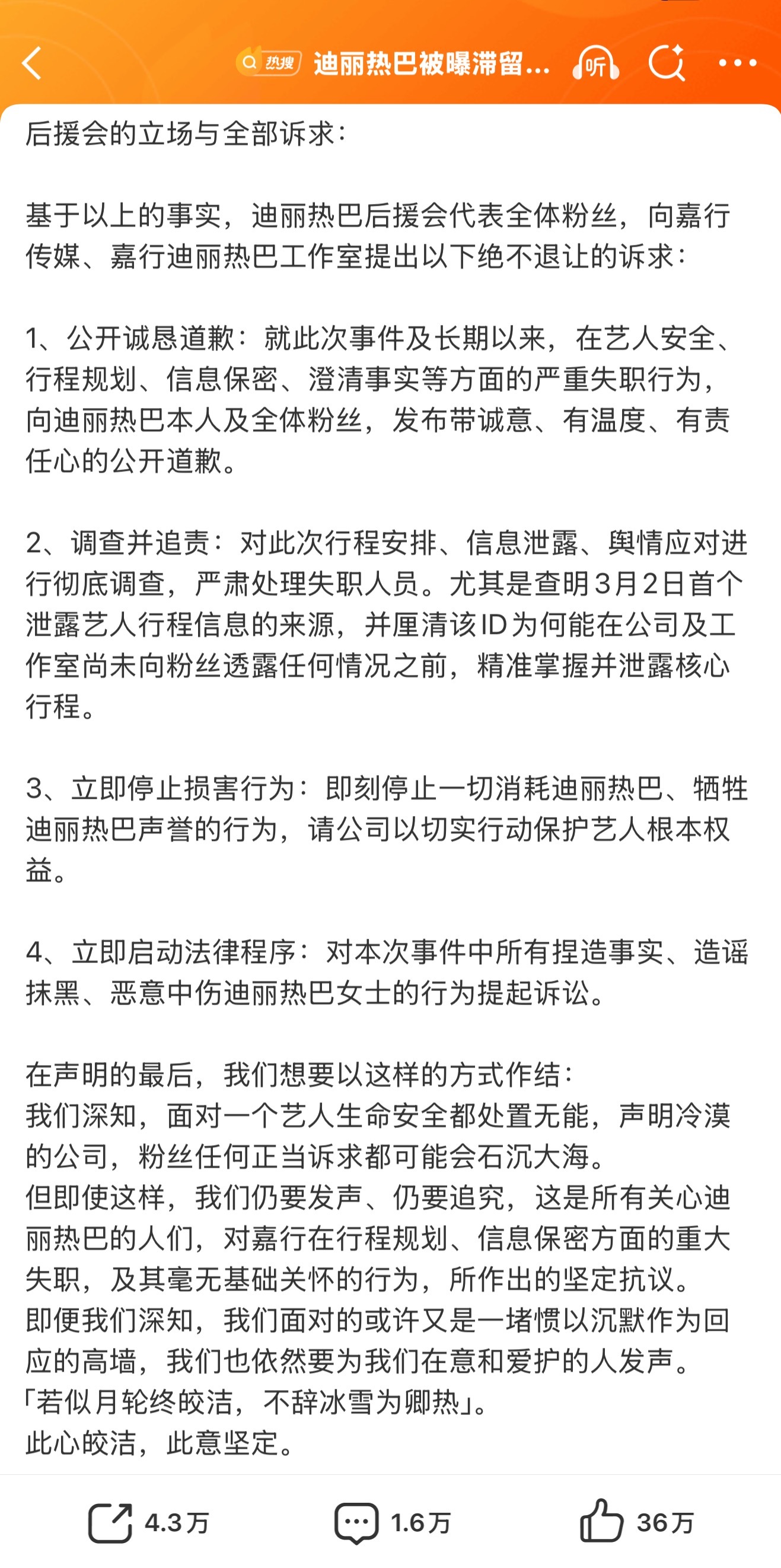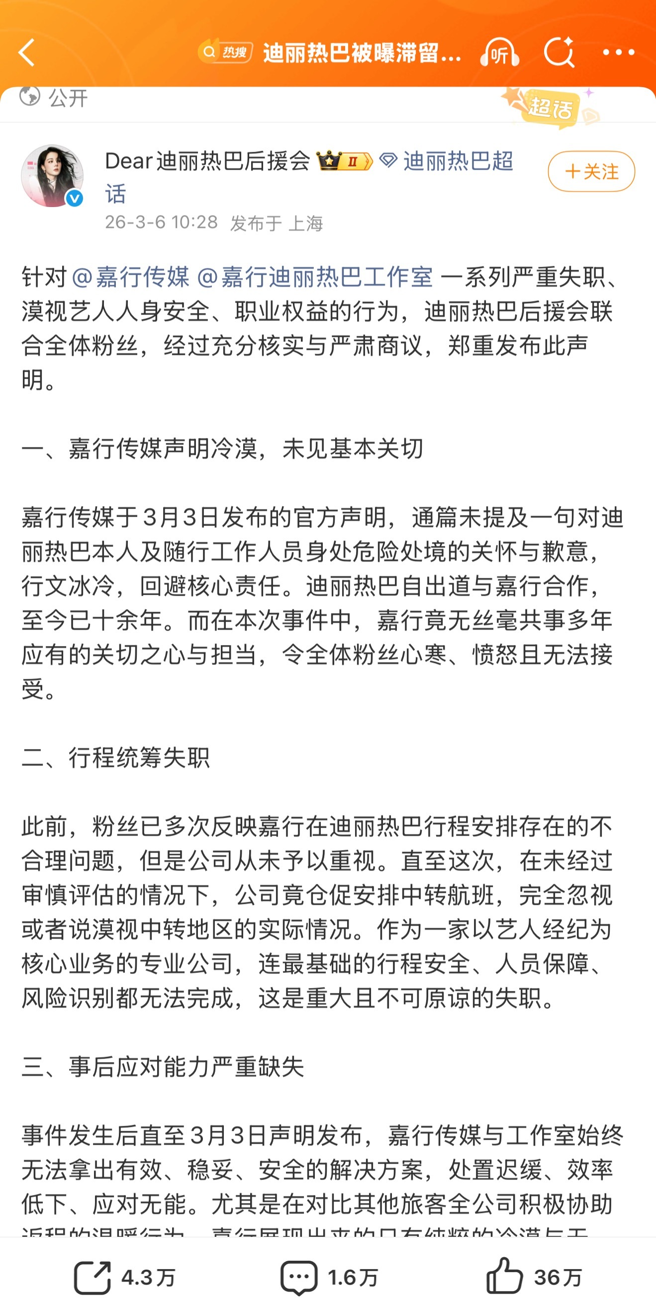 迪丽热巴后援会发文维权了本来这就是嘉行传媒统筹重大失误,把两个小女生置于危险中,但凡上一点网都知道现在什么局势,可偏偏就捂住耳朵和眼睛 对于3.3号的声明全篇丝毫没有对此次统筹失败的觉悟,丝毫没有关心艺人和同行助理安全,两个小女孩在滞留中,而他们在回复迪丽热巴没解约哎呀我的妈呀,这公司…