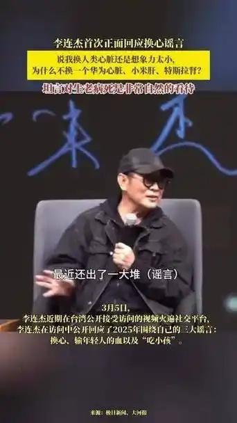 2026年3月,李连杰在台湾公开受访时首次正面回应“换心”谣言,笑称造谣者“想象力太小”,调侃“为何不换华为心脏、小米肝、特斯拉肾”。他撩衣展示无疤痕胸口,直言心脏健康无需移植,幽默化解荒诞传闻。晚年李连杰