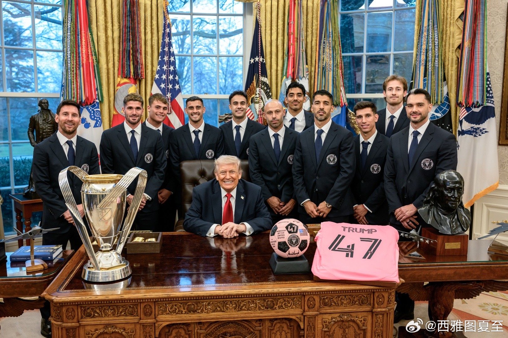 梅西所在的队,是今年美国职业足球大联盟冠军今天访问白宫,赠47号球衣、全队签名足