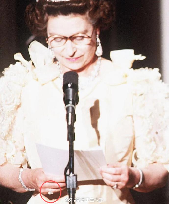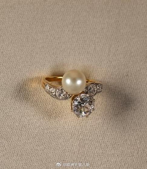 曾属于英国玛丽王后的珍珠钻石戒指,设计比较别致,一颗圆形珍珠+一个圆形钻石,这种双石设计寓意“你和我”,那会还挺流行 这戒指是玛丽在1893年跟未来英王乔治五世结婚时三个弟弟送的礼物,寓意的确不错,可看着从体量上看的确很不起眼,尤其是玛丽嫁进英国王室后大块头珠宝多得让人看不过来 毕竟是弟弟们的心意,玛丽应该戴过不止一次,但照片不好淘,意会即可= =后玛丽将戒指留给了大孙女伊二,她偶尔在大晚宴佩戴,不认真看还真看不出来