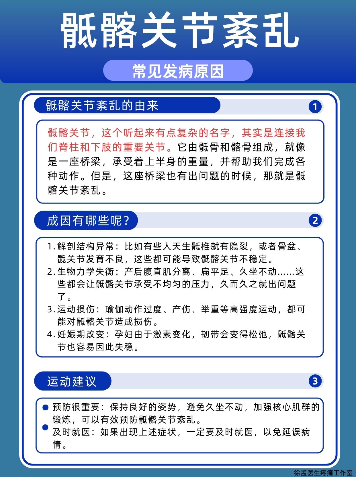 解剖结构异常:比如有些人天生骶椎就有隐裂,或者骨盆、髋关节发育不良,这些都可能导致骶髂关节不稳定。