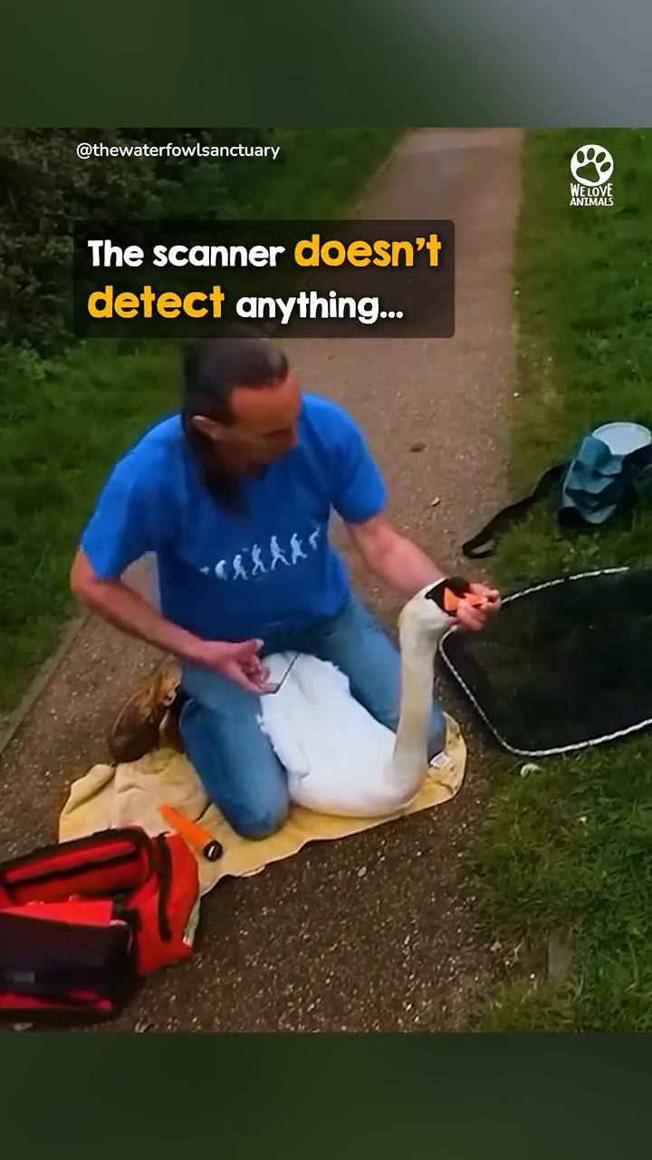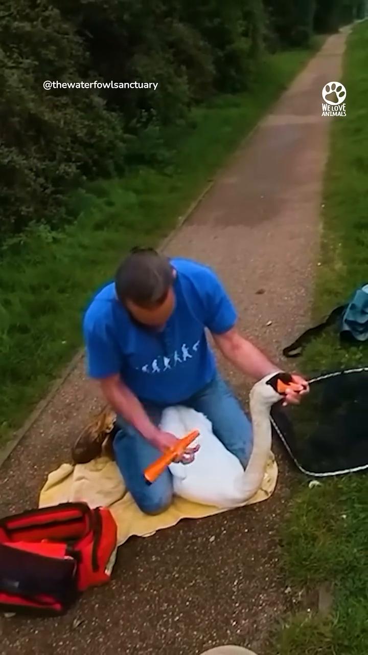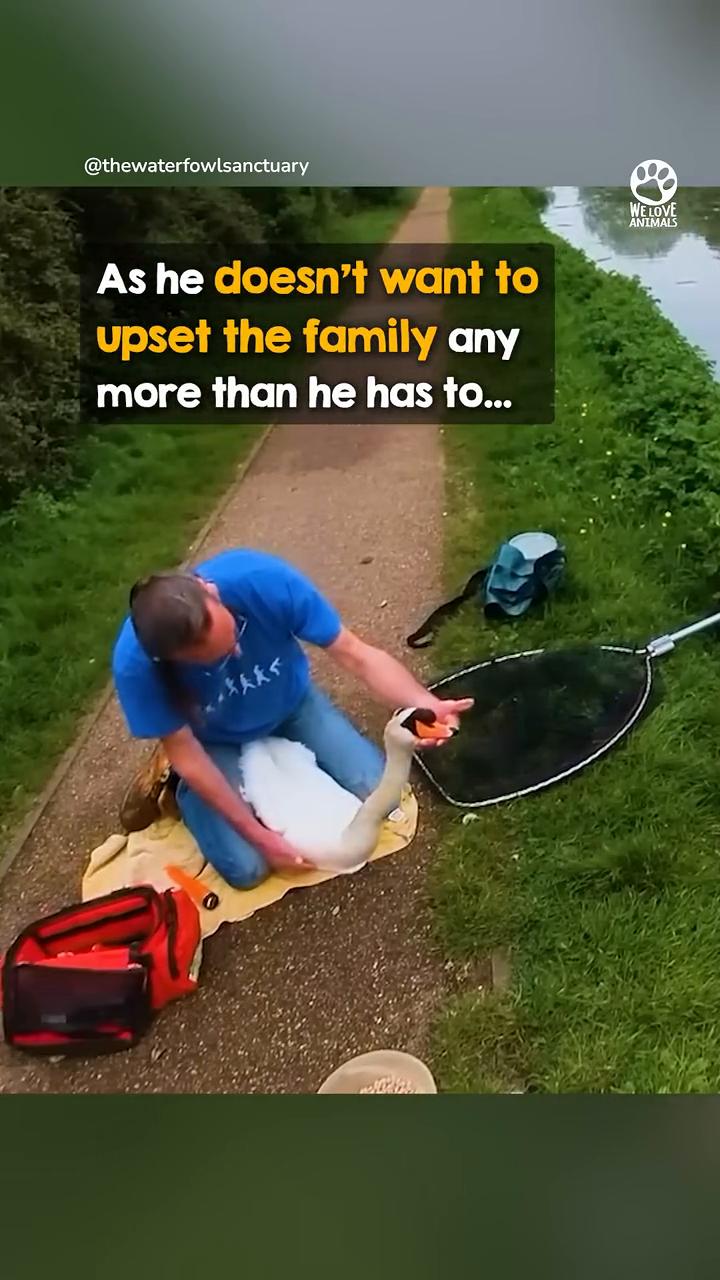 This man suddenly hauls up a swan...and his mate rushes in to protect him.Graham needs to examine the swan...but mama swan doesn't know that...and fiercely protects the male swan had been seen struggling with his neck...and it seemed like he might be trapped in fishing line. Mama swan approaches...It's OK,mom.examining the swan.impressively calm.and steadily begins. The Waterfowl Sanctuary had been contacted...after a good samaritan spotted the swan.struggling to keep its head above water. Graham picks up a small metal scanner...and looks for any metal or hooks.while mama watches over them. The scanner doesn't detect anything...so the experienced waterfowl rescuer examines his neck by hand. But Graham can't all the joints appear to flex correctly...and he can't see any swelling. As he doesn't want to upset the family any more than he has to...or leave mama swan him to the sanctuary. he decides not to bring Instead, he decides to reunite the family..and mama is very happy to have her mate back. The beautiful family is so happy to be together...thank you Graham and The Waterfowl Sanctuary for checking on him. For more information on how to support the i important work:thewaterfowlsanctuary.co.uk。