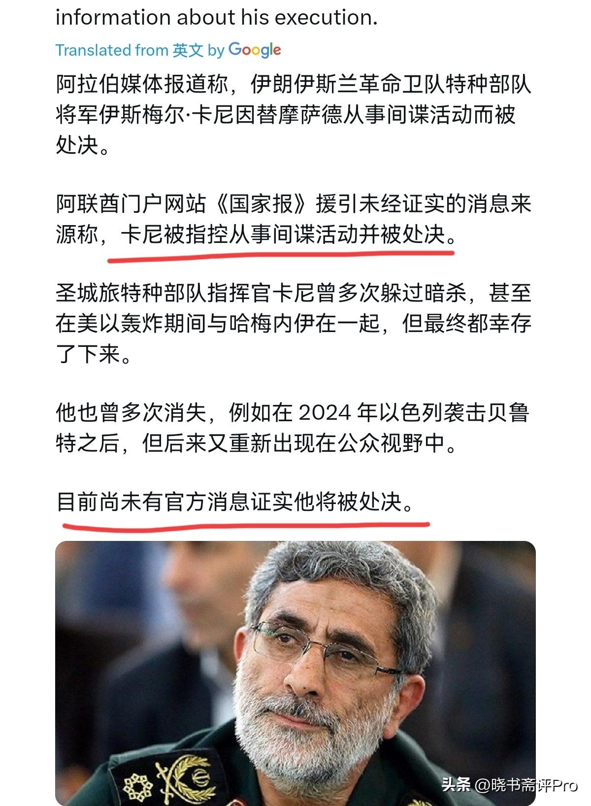 骇人听闻!伊朗内部居然隐藏着这么高级别的奸细!3月6日,外媒报道称,伊斯兰革命卫队特种部队将军伊斯梅尔·卡尼因代表摩萨德从事间谍活动而被处决。伊斯梅尔·卡尼是特种部队的负责人,在多次暗杀企图中幸存下来,甚至在美以轰炸期间与哈梅内伊在一起但都幸存了下来。 很显然,这一则消息真是骇人听闻,作为革命卫队特种部队最高指挥官,此人手中握有的是伊朗最精锐力量的指挥权、中东地区代理人武装的全部布局、以及高层安保与行动路线的绝密信息,并且还是能够直接接触最高领袖、参与生死决策的核心人物。这样的人物可以说是伊朗国家安全的“盾与剑”。 此人竟然投敌当奸细,这无异于把伊朗的防空、情报、指挥体系全盘向美以敞开,让伊朗整个国家的安全防线形同虚设。这不是普通泄密,而是对伊朗权力中枢与国防根基的致命击穿。怪不得以色列击杀伊朗革命卫队高层以及最高领袖哈梅内伊屡屡得手,原来有这么高级别的内奸做内应。这样的人,任何一个国家都是叛国者,都应该永远被钉在耻辱柱上。