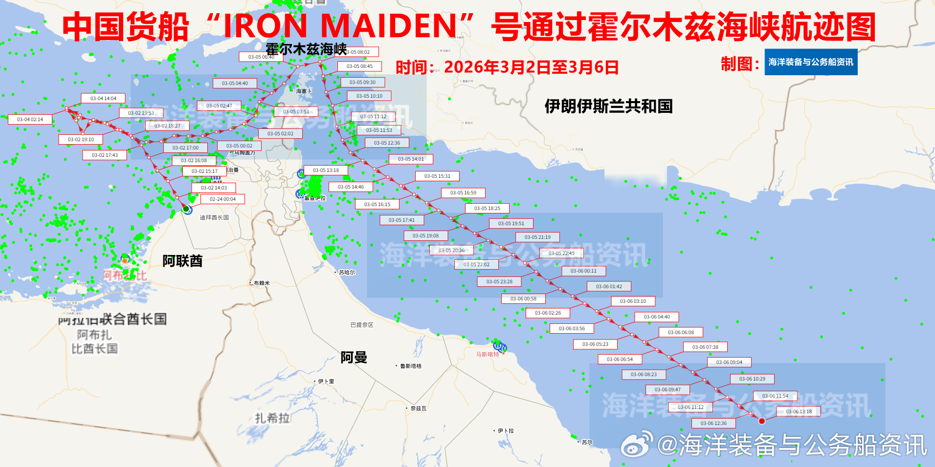 伊朗称仅允许中国船只通过霍尔木兹在中东局势持续紧张,美国、以色列对伊朗发动猛烈袭击和侵略行动、地区冲突不断升级的背景下,全球多数商船对霍尔木兹海峡望而却步,而中国船只疑似获得通行许可。据公开的AIS航迹显示(图1),3月2日离开迪拜、已在波斯湾漂航多日的散货船“铁娘子”号(Iron Maiden)于3月5日凌晨将船舶识别信号从“待指示”调整为“中国所有”(CHINA OWNER),在3月5日凌晨至5日上午,以12-13节的航速沿阿曼海岸线顺利通过海峡航道。截至3月6日中午,该船已经顺利进入阿拉伯海。(图2)为该船2024年在美国西雅图卸货时的资料图。美以伊冲突以色列宣布袭击伊朗哈梅内伊遇害