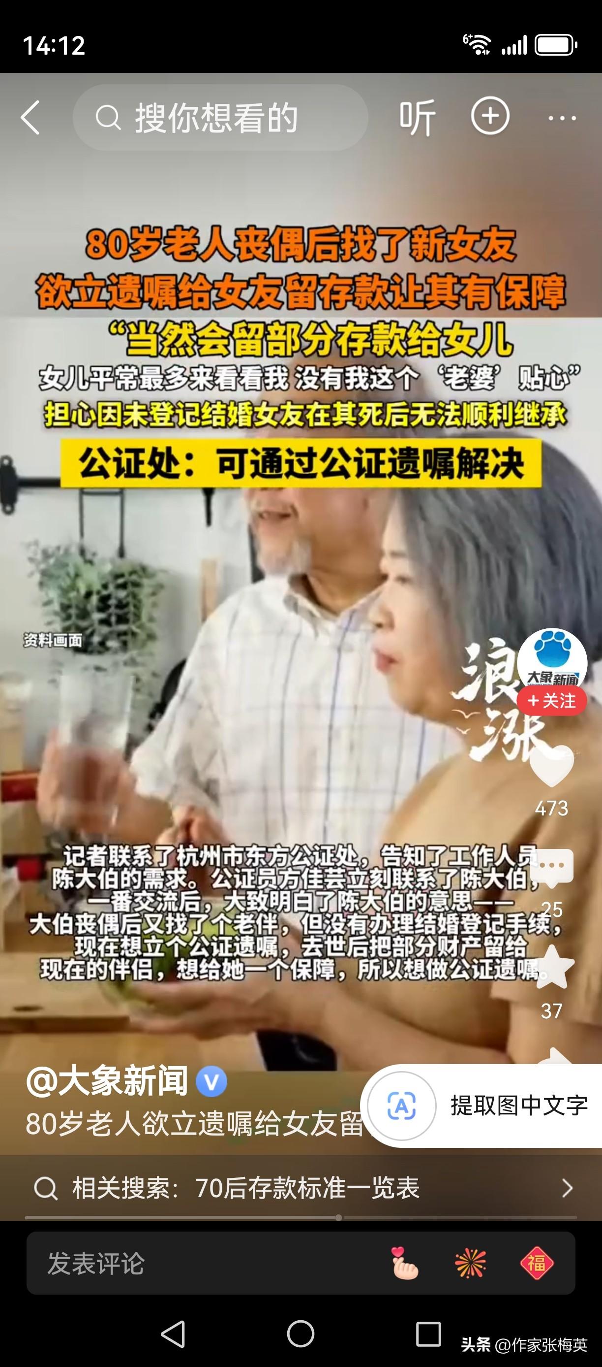 我想把存款留给女朋友,万一女儿不愿意咋办? 杭州拱墅区80岁陈大伯最近有点愁:想给照顾了自己三四年的"老婆"留点存款,又怕女儿和"老婆"将来为钱闹纠纷。 "我们没有登记结婚,但我当她是老婆。我老了,她把我照顾得很好。"陈大伯说,前妻早年离世,女儿虽有家庭但"没有这个老婆贴心"。 他担心:自己走后,女儿作为法定继承人能查银行存款,而没领证的"老婆"可能一分钱都拿不到。 网友吵翻了—— 🔴支持派: "老人晚年谁照顾谁受益,天经地义!女儿只是偶尔看看,人家朝夕陪伴三四年,给点保障怎么了?" "没领证就不是夫妻,不立遗嘱真的一分钱拿不到,老人想得明白。" 🔵质疑派: "女儿再不好也是亲生的,把存款给'女朋友',寒了女儿的心。" "三四年就抵得过几十年父女情?别是被人骗了吧,老人可别糊涂。" 你怎么看?👇 - 杭州身边事 老年人权益 黄昏恋 遗嘱公证 社会百态 #80岁老人欲立遗嘱给女友留存款