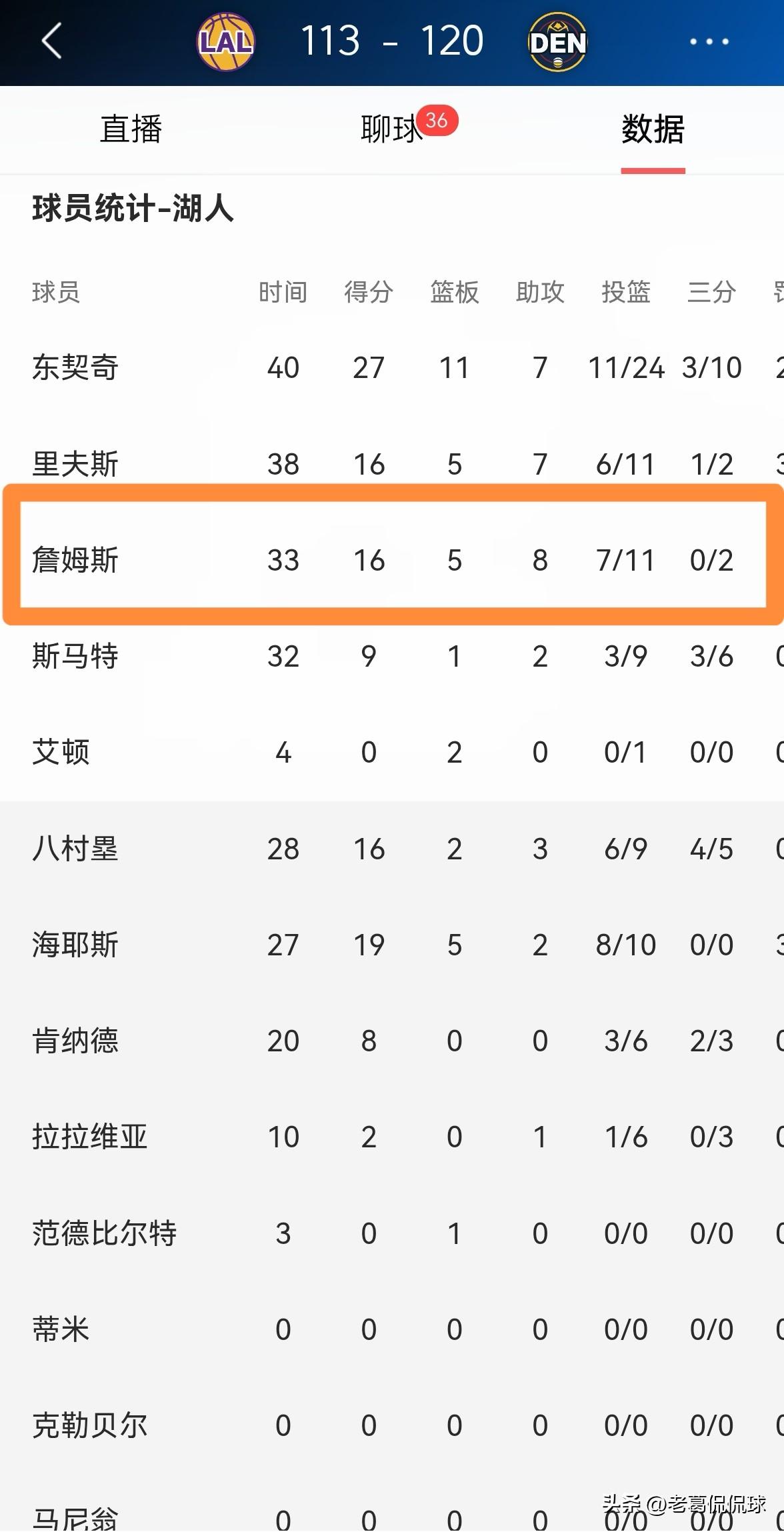 湖人巨星詹姆斯真是太可悲了!虽然今天湖人在客场以113:120输给掘金,但是詹姆斯的职业生涯投篮命中数超越了湖人传奇名宿贾巴尔,升至NBA历史第一。可悲的是,由于湖人的输球,詹姆斯的里程碑时刻直接变成了里程悲。 全场比赛下来,詹姆斯首发出战33分钟,投篮11中7,其中三分球2中0、罚球2中2得到16分5篮板8助攻3抢断1盖帽,他的场上正负值为-10。
