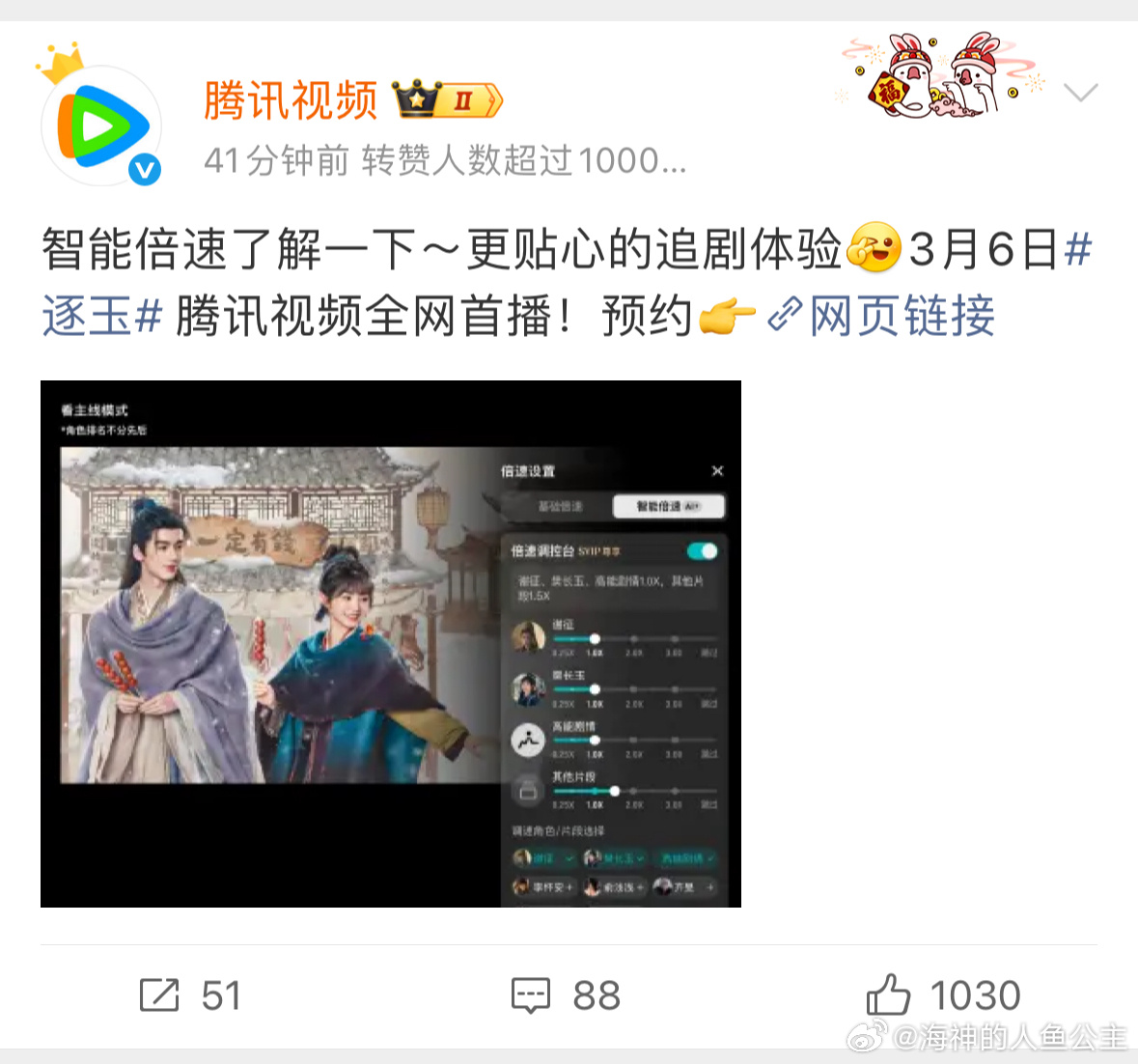 逐玉 智能倍速看剧 🐧出了智能倍速,可以根据角色片段自定义倍速🥝放出了张凌赫田曦薇的历史角色☁️包场2000座+两个平台为了抢观众也是放招了...逐玉