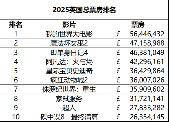 英国周末票房(2.28-3.1):1.《惊声尖叫7》开画夺冠;2.《飞驰人生3》英国上映排名单周第7;3.《疯狂动物城2》累计票房3600万超《侏罗纪世界:重生》排名2025年度第6。(数据:BFI)