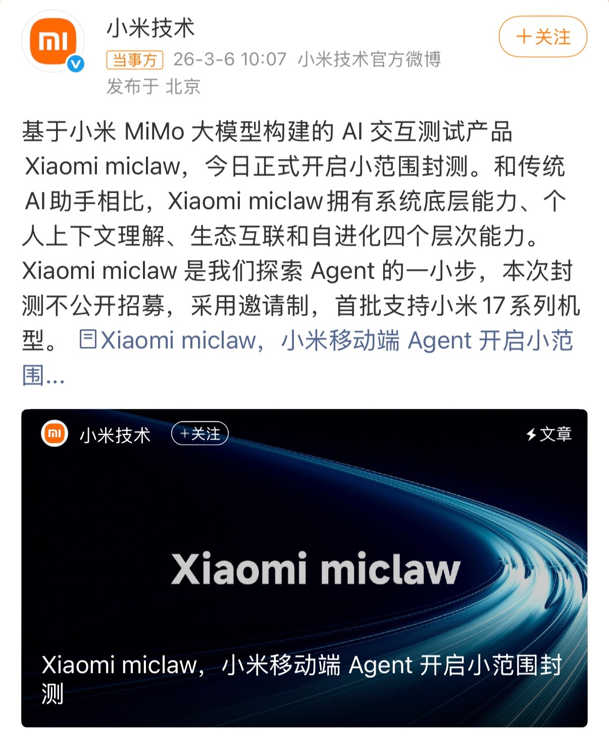 小米发布国内第一个手机版龙虾小米龙虾(miclaw)是国内首款手机端AI智能体,依托MiMo大模型,获授权后自主拆解指令、调用系统与生态工具执行,记忆沉淀越用越懂,一句话就能全自动办完事。