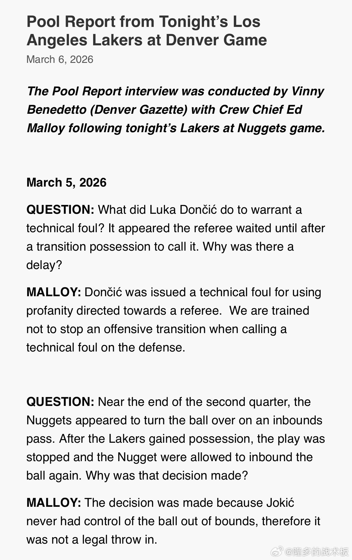 问: 东契奇为什么会吃到技术犯规?看起来裁判是等到一次转换进攻结束后才吹罚的,为什么会有延迟?马洛伊: 东契奇因对裁判使用辱骂性语言被吹技术犯规。我们的要求是在对防守方吹罚技术犯规时,不能中断进攻方的转换。
