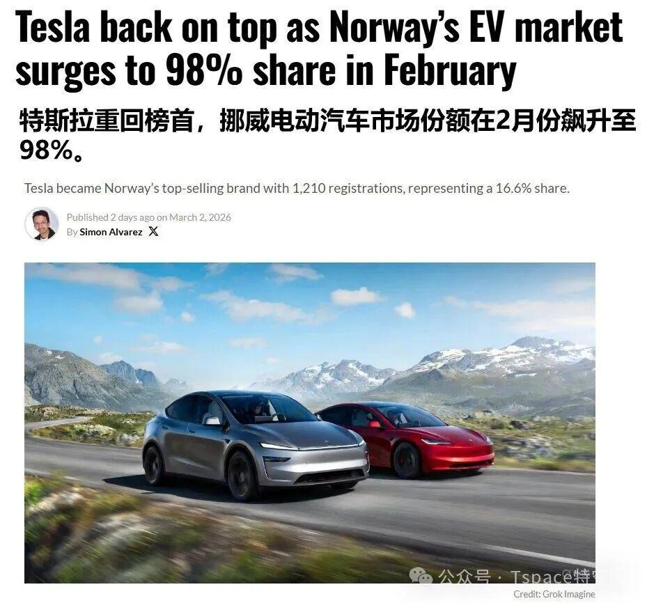 据挪威道路联合会(OFV)最新统计数据,在2月挪威车市,特斯拉凭借16.6%的市场份额,成为最受挪威消费者欢迎的乘用车品牌。当月,挪威纯电动车市场占有率高达98%,这也让其成为全球纯电动化程度最高的国家。