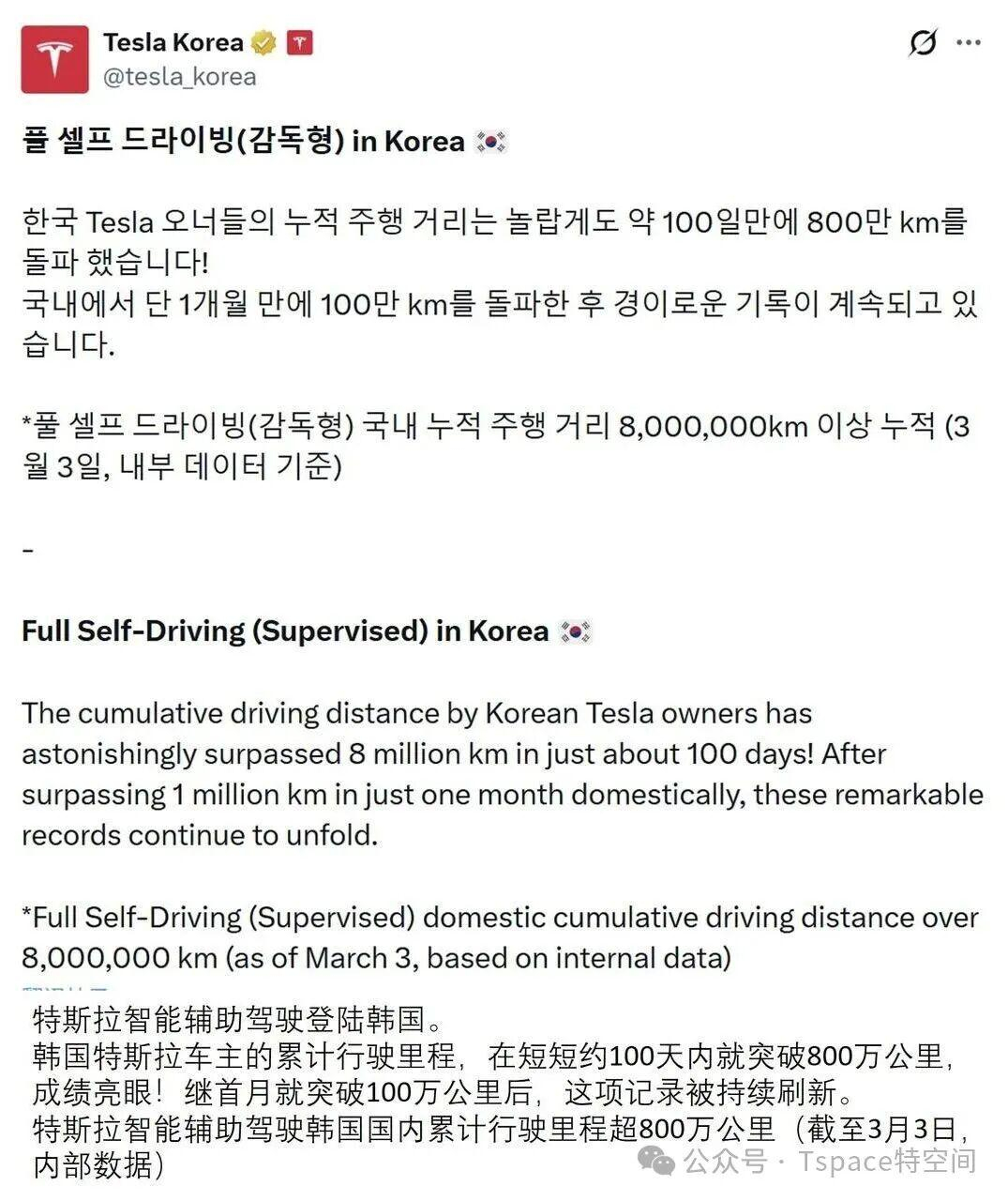 特斯拉在海外社交平台宣布,智能辅助驾驶在韩国上线100天时间,累计行驶里程已突破800万公里。据了解,该功能上线首月,当地车主行驶里程就已突破100万公里,如今再次刷新里程碑式纪录。