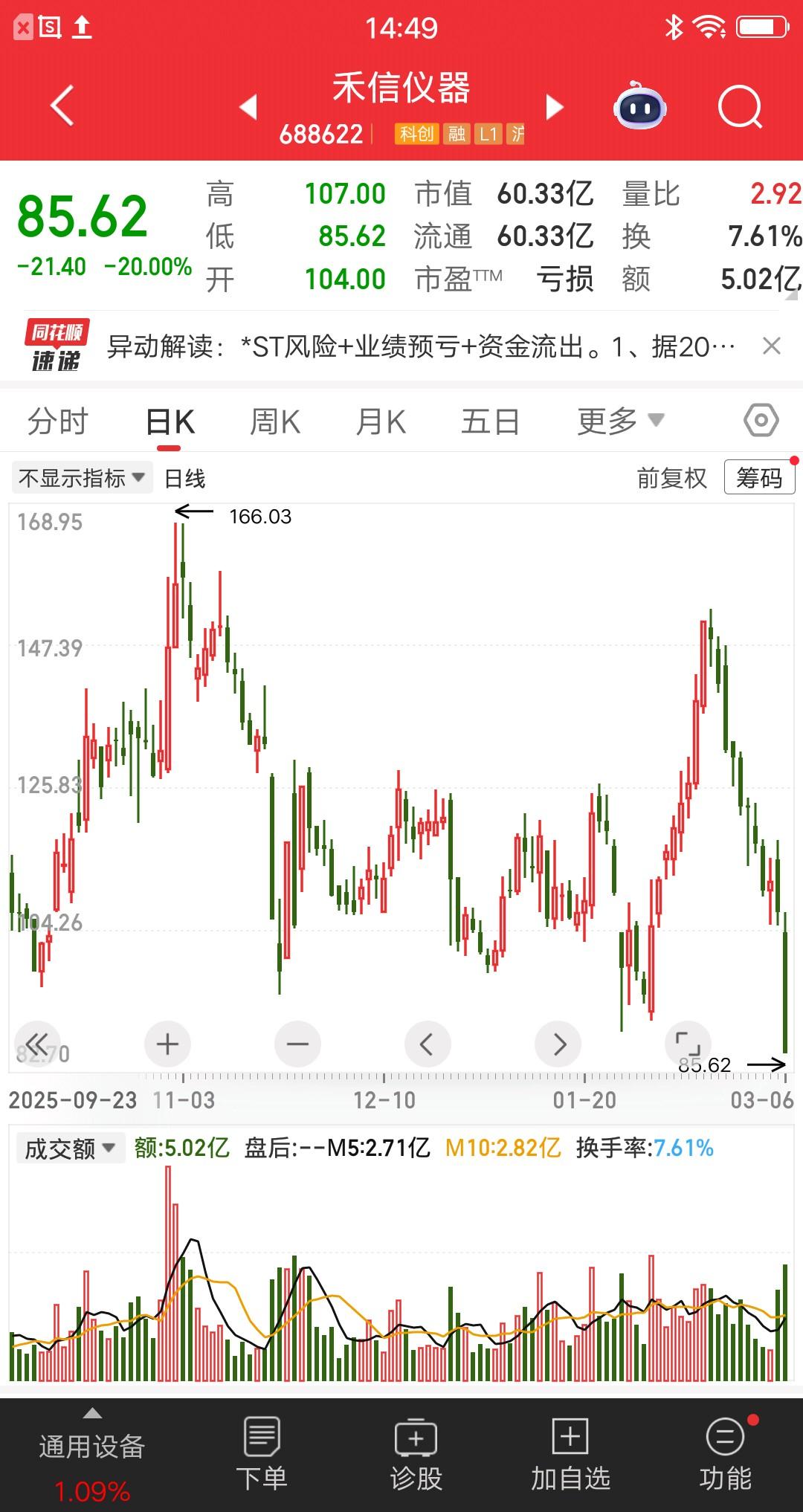 A股今天最惨的票诞生了,业绩暴雷,可能被实施退市风险警示。目前有3228户股东,账户亏麻了,想死的心都有了。 该票开盘后逐步走低,最终20cm跌停,相当于两个地板。全天成交量4.93亿,还有0.18亿资金被埋。没有出现一字跌停,说明主力在维护股价,已经很不错了。 日线看,该票跌得更惨,11个交易日跌43%。高位没卖的散户,账户惨不忍睹呀。需要涨75%才能回本,有这个能力吗? 以下是详细业绩数据: 1. 据2026年2月27日公告,公司预计2025年年度实现归属于母公司所有者的净利润为-8900万元左右,同比下降93.52%左右;预计实现归属于母公司所有者扣除非经常性损益后的净利润为-9300万元左右,同比下降47.39%左右;预计实现营业收入9700万元左右,同比下降52.10%左右。扣除与主营业务无关的业务收入和不具备商业实质的收入后的营业收入预计为9000万元左右,低于1亿元。若公司经审计的扣除非经常性损益前后的净利润孰低者为负值,且营业收入低于1亿元,公司股票将在2025年年度报告披露后可能被实施退市风险警示。