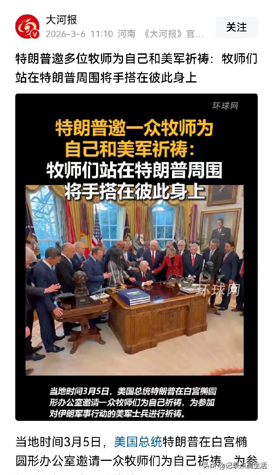 不可一世的特朗普也怕了吗? 在总统办公室就让牧师给自己祈祷,也算是开了先河了。 不过这时候才想起来让上帝帮助他们,是不是有点太晚了,自己都把上帝在人间的代言人给炸死了,能不能得到原谅都难说。 不过有网友指出了一些漏洞,这样也就是做做样子,牧师没有穿长袍、拿法器、设祭坛、捧圣经,说明不够专业,太业余了。 当然我们可不相信这套,他们搞出来这套,无非就是给自己和美国大兵一个心理安慰罢了,典型的自欺欺人。 如果真的有神明,那些信奉上帝的人,就不会惨死了,更不会庇护他们这种双手沾满杀戮的人间魔鬼了,不然谁还会供奉他们。