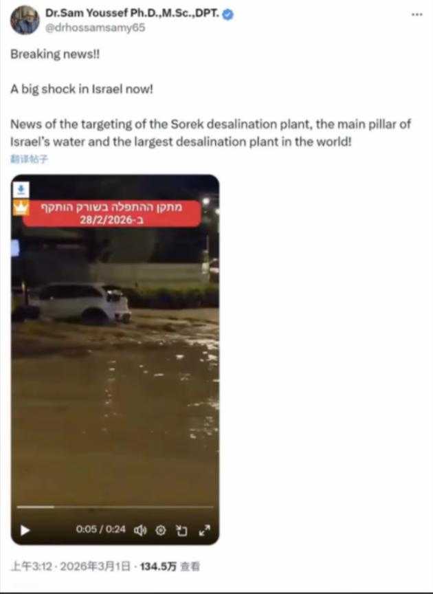 伊朗终于对以色列水厂下手了!这一炸,比炸军事基地还狠。 伊朗终于对以色列的海水淡化厂下狠手。这一场精准打击,远比炸毁普通军事基地更致命。它直接戳中了以色列最脆弱的生存软肋,让这个看似强悍的中东国家,瞬间陷入关乎民生根基的致命危机。 2026年3月1日凌晨,伊朗革命卫队动用“法塔赫”高超音速导弹,精准命中特拉维夫以南的索雷克海水淡化厂。这款导弹速度快、精度高,能轻松突破以色列多层防空反导系统,根本来不及拦截。导弹搭载集束弹药直击厂区核心,爆炸后覆盖关键作业区域。索雷克海水淡化厂不是普通厂房。它是全球规模顶尖的反渗透海水淡化厂,也是以色列供水体系的核心支柱。该厂分两期建成投用,单日淡水产能高达130万立方米,占据以色列全国淡水产能的三分之一以上。 这场袭击破坏力极强。厂区内的输水主管道彻底断裂,反渗透膜设备尽数损毁,供电系统全面瘫痪,甚至出现海水倒灌的情况。以色列工程部队第一时间赶赴现场勘察,给出的结论毫无转圜余地。核心设备全靠海外进口,重建调试周期至少需要两年,短期内根本无法恢复供水。 紧接着,阿什杜德、帕尔马奇姆两座配套海水淡化厂也遭遇袭击。三座核心水厂同时停摆,以色列全国近45%的淡水供应直接中断。特拉维夫、海法等核心城市当即启动三级供水限制,居民生活用水被严格管控。当地超市的瓶装水被民众疯狂抢购,货架短短几小时就被清空。医院诊疗、工业生产、农业灌溉接连受影响,整个以色列都被缺水的恐慌笼罩。 以色列会被一座水厂的损毁逼入绝境,根源在于先天水资源条件极度恶劣,海水淡化早已成为不可替代的生存支柱。以色列国土面积狭小,三分之二的土地被沙漠覆盖,全年平均降水量不足200毫米,属于极度干旱地区。 联合国相关机构数据显示,以色列人均年水资源占有量不足300立方米,远低于全球公认的500立方米贫水线标准,水资源匮乏程度位居世界前列。当地天然淡水来源极度有限,唯一的天然淡水湖加利利海,水位常年跌破警戒线,年抽水量仅剩4000万立方米,仅能支撑全国10%的供水需求。 地下水资源也早已过度开采,无法满足全国用水刚需。以色列950万常驻人口,仅靠天然降水、地下水和加利利海的水源,最多只能养活300万人。剩余大部分用水缺口,只能依靠海水淡化填补。多年来,以色列耗费巨资打造海水淡化体系,沿地中海建起五座大型海水淡化厂。这些水厂承担着全国80%以上的民用饮用水供应,相当于以色列人每喝五杯水,就有四杯来自海水淡化。 索雷克水厂作为其中产能最大、地位最核心的设施,堪称以色列的“大水缸”。它的瘫痪,直接打破了以色列苦心搭建的供水平衡。有人或许疑惑,炸毁军事基地难道不比水厂更有威慑力。答案是否定的。军事基地损毁可以快速抢修、兵力可以快速调配,哪怕战机、坦克受损,也能通过外援补充战力。 可水资源不一样。水是生命之源,是维系社会运转的基础。普通人没水喝,会陷入生存危机;军队没水补给,再先进的武器装备也无法运转;农业没水灌溉,农作物会颗粒无收;工业没水支撑,生产线会全面停滞。以色列此前也曾遭遇各类军事打击,却从未像这次一样陷入全民恐慌。以往的冲突中,打击目标多集中在军事设施、指挥中枢,即便造成损失,也不会动摇民生根本。 2021年,索雷克水厂曾遭遇黑客攻击,短暂停摆数日,就引发当地小规模供水恐慌。如今核心设施被彻底炸毁,修复周期长达两年,对以色列的冲击堪称毁灭性。以色列即便拥有强悍的军事实力,也无法在短时间内填补巨大的用水缺口。它没有足够的备用供设施,海外调水成本极高且运输难度大,国内再生水仅能满足农业灌溉需求,根本无法支撑居民日常饮用。 这场针对水厂的打击,没有漫天炮火的震撼,却精准掐住了以色列的生存七寸。它用最直接的方式证明,在绝对的生存需求面前,再强大的军事力量也显得无力。伊朗这一击,看似针对一座水厂,实则直击以色列的战略短板。这场冲突也让外界看清,现代战争的较量,早已不止局限于军事层面,关乎民生根基的基础设施,往往是更致命的博弈筹码。