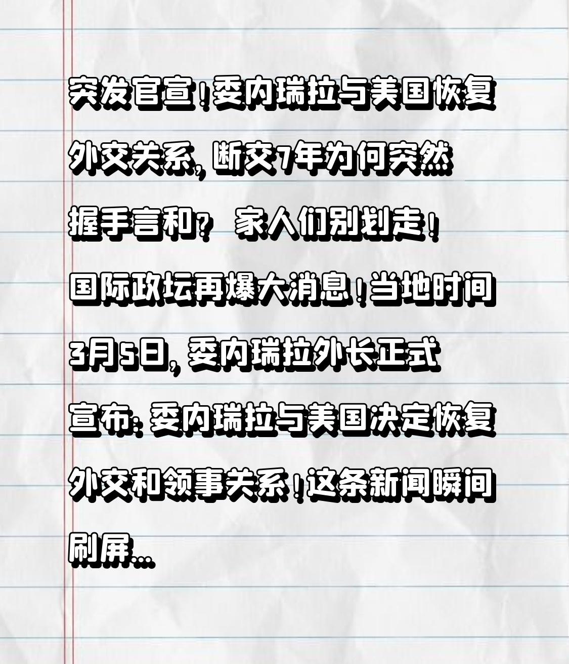 突发官宣!委内瑞拉与美国恢复外交关系,断交7年为何突然握手言和? 家人们别划走!国际政坛再爆大消息!当地时间3月5日,委内瑞拉外长正式宣布:委内瑞拉与美国决定恢复外交和领事关系!这条新闻瞬间刷屏全球,要知道两国已经断交整整7年,从军事对峙、制裁封锁到如今重启建交,背后的反转太惊人! 时间拉回2019年,因美国公然干涉委内瑞拉内政、扶持反对派,马杜罗政府果断宣布与美国断交,美驻委外交人员全部撤离。此后7年,美国对委实施全方位制裁,冻结海外资产、封锁石油出口,试图掐断这个石油大国的经济命脉;双方更是多次军事对峙,拉美地区局势一度剑拔弩张。 就在今年1月,美军还对委内瑞拉发动大规模军事打击,全球都以为两国关系彻底没救了。可转折点来了!短短两个月后,双方突然握手言和。美国外交使团早已抵达加拉加斯,两国敲定外交对话路线图,从兵戎相见到重启建交,剧情反转速度快到让人反应不过来。 很多人疑惑,这对死对头为何突然和解?其实背后全是现实考量:美国急需委内瑞拉的石油资源,缓解国内能源压力;委内瑞拉则希望解除制裁,重启经济复苏。双方都放下执念,选择在相互尊重的基础上,开启建设性对话。 这一幕彻底撕开国际交往的真相:没有永远的敌人,只有永远的利益。7年断交,两国都付出了沉重代价;如今重启外交,既是为了各自发展,也是拉美地区和平稳定的福音。没有谁愿意一直活在对抗里,坐下来谈,远比打打杀杀更有意义。 从断交到复交,我们看到了霸权主义的收敛,也看到了小国坚守主权后的底气。这个世界从来不是靠强权说了算,平等对话、互利共赢,才是国与国相处的正道。 愿对抗越来越少,和平越来越多;愿每个国家都能独立自主,不用在大国博弈中艰难求生。为这来之不易的和解点赞,愿世界永远远离战火与制裁!