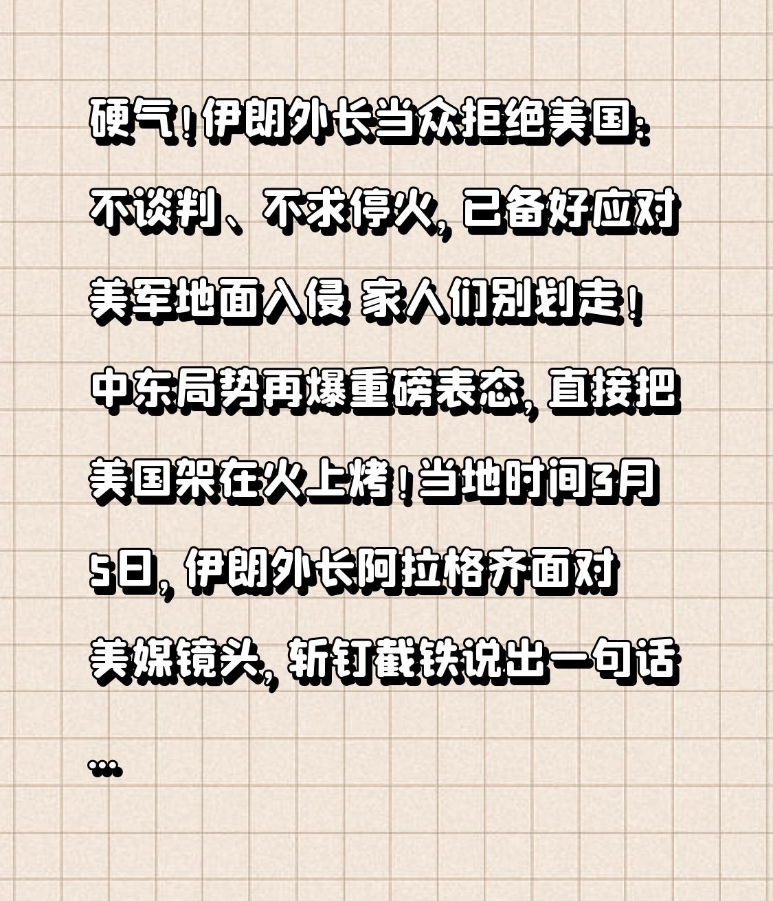 硬气!伊朗外长当众拒绝美国:不谈判、不求停火,已备好应对美军地面入侵 家人们别划走!中东局势再爆重磅表态,直接把美国架在火上烤!当地时间3月5日,伊朗外长阿拉格齐面对美媒镜头,斩钉截铁说出一句话:我们没有理由与美国谈判,也从未请求停火!一句话引爆全球舆论,这场大国对峙,彻底没有退路了! 谁都知道,近期美以对伊朗发动密集空袭,核心军政目标遭重创,外界普遍以为伊朗会主动求和、坐回谈判桌。可伊朗用最硬的回应,打了所有看衰者的脸。外长直言,伊朗曾两次在谈判中途遭美军攻击,所谓“对话”,不过是美国一边施压一边动武的幌子,信任早已彻底破碎。 转折点来了! 伊朗不是嘴硬,是真做好了鱼死网破的准备。阿拉格齐公开放话:伊朗已全面备战,足以应对美军地面入侵,敢登陆就是美国的巨大灾难!一边是特朗普宣称“打击无时间限制”、美军宣布行动再升级;一边是伊朗权力平稳交接、全国同仇敌忾,连航母都被逼退千里,中东战局彻底走向失控边缘。 更戳人的是,伊朗拒绝的不是和平,而是屈辱的和平。美国一边喊谈判,一边制裁、空袭双管齐下,要的是伊朗放弃主权、自废武功。但伊朗用行动证明:小国也有尊严,弱国也有脊梁,绝不接受刀架在脖子上的“对话”。 这一幕让我们看清:这个世界从来没有真正的公平,只有实力才能守住尊严。美国想靠强权逼别国低头,早已行不通。伊朗的强硬,是被逼到墙角的反击,更是对霸权主义最响亮的耳光。 没有谁天生好战,只是不愿任人宰割。愿战火早日熄灭,愿每个国家都能平等对话,愿霸权不再横行,愿和平真正照亮中东大地!为坚守主权的伊朗点赞,也为天下苍生祈愿安宁!