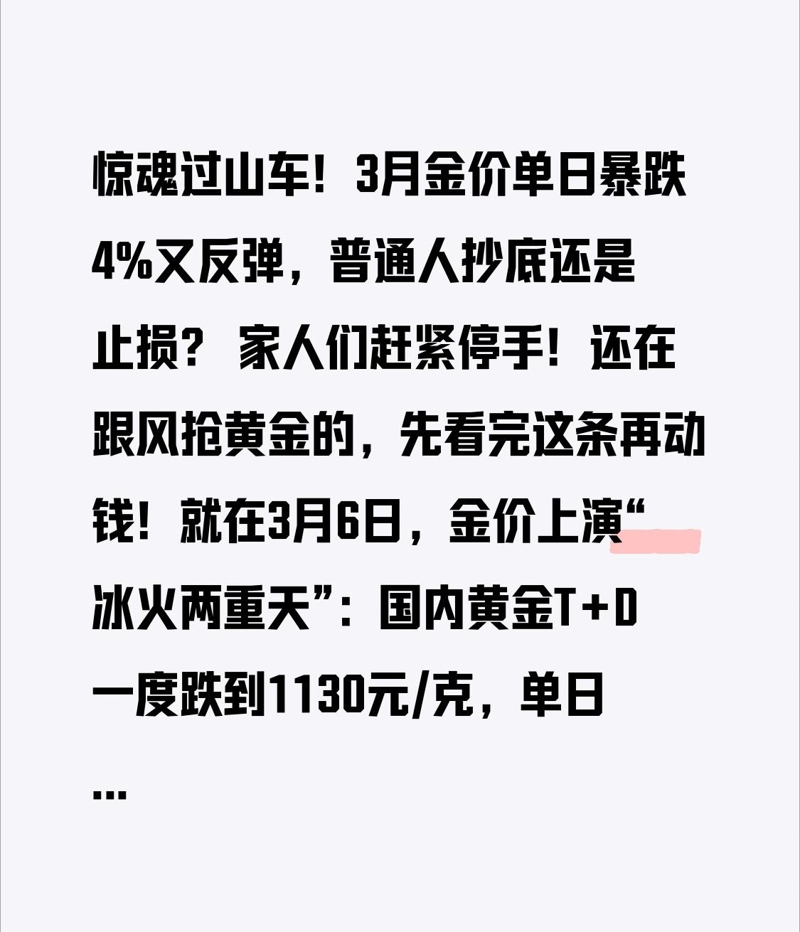 惊魂过山车!3月金价单日暴跌4%又反弹,普通人抄底还是止损? 家人们赶紧停手!还在跟风抢黄金的,先看完这条再动钱!就在3月6日,金价上演“冰火两重天”:国内黄金T+D一度跌到1130元/克,单日最大跌幅超4%,可伦敦金现又快速反弹至5113美元/盎司,半天波动超80元/克!有人刚高位梭哈就亏掉半年工资,有人趁回调抄底赚了差价,这波波动背后,藏着普通人必须知道的真相。 就在一周前,金价还在疯狂狂飙!3月1日,伦敦金现一度冲上5276美元/盎司的阶段新高,国内金店足金卖到1652元/克 。当时全网都在传“金价要破6000”,不管是银行网点还是金店,全是排队买金的人,就连年轻人都开始“黄金定投”,生怕错过暴富机会。 可转折点来得猝不及防!3月2日开始,金价突然“断崖式”下跌。核心原因有三个:一是中东冲突双方释放谈判信号,避险溢价瞬间消退;二是美国经济数据超预期,市场对美联储降息的预期降温,美元走强压制金价;三是前期赚得盆满钵满的机构集中套现,直接带崩了市场情绪。短短3天,不少跟风买高溢价金饰的人,账面浮亏就超过20%。 但别慌!这波暴跌并非趋势反转。世界黄金协会数据显示,全球央行已经连续9年净购金,2026年年初至今,新兴市场央行还在加大配置;而且美联储降息周期确定开启,历史数据显示,降息后12个月黄金平均涨幅超15% 。这两大支撑,让金价很难出现长期大跌,当前的波动,更多是短期情绪的宣泄。 最扎心的是,每次金价波动,受伤的都是跟风的普通人。有人把金饰当投资,溢价高达30%,回收时直接亏惨;有人盲目加杠杆炒黄金T+D,一天就爆仓清零;还有人听信“内幕消息”,掉进非法炒金平台的陷阱。 其实,金价波动不可怕,可怕的是我们没有理性的认知。黄金从来不是一夜暴富的工具,而是家庭资产的“压舱石”。它的核心作用是对冲风险,不是短线投机。 这波行情给我们上了生动的一课:财富的积累,从来不是靠跟风追涨,而是靠清醒的判断和自律的规划。不分消费与投资,盲目跟风的人,注定被市场收割;而那些坚守纪律、分批布局、控制仓位的人,才能在波动中守住底气。 愿我们都能戒掉“暴富焦虑”,看清投资的本质。不被市场的疯狂裹挟,不被短期的波动吓倒,用理性和耐心,守住属于自己的财富。毕竟,真正的安全感,从来不是靠一块黄金,而是靠我们对金钱的掌控力。