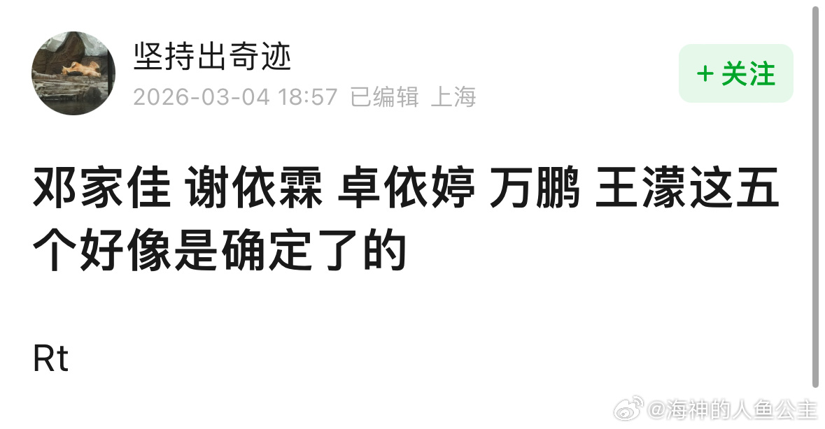 目前传的浪姐名单1、赵子琪,团队发了服装招商的🍠基本是第一位锤的姐姐2、李小璐辟谣了,节目组快去邀约啊,她其实挺适合浪姐3、其他🍉舒畅、叶璇4、邓家佳、谢依霖、卓依婷、万鹏、王濛5、by2姐妹,有试装图,但不知道是为初舞台还是浪姐乘风破浪的姐姐