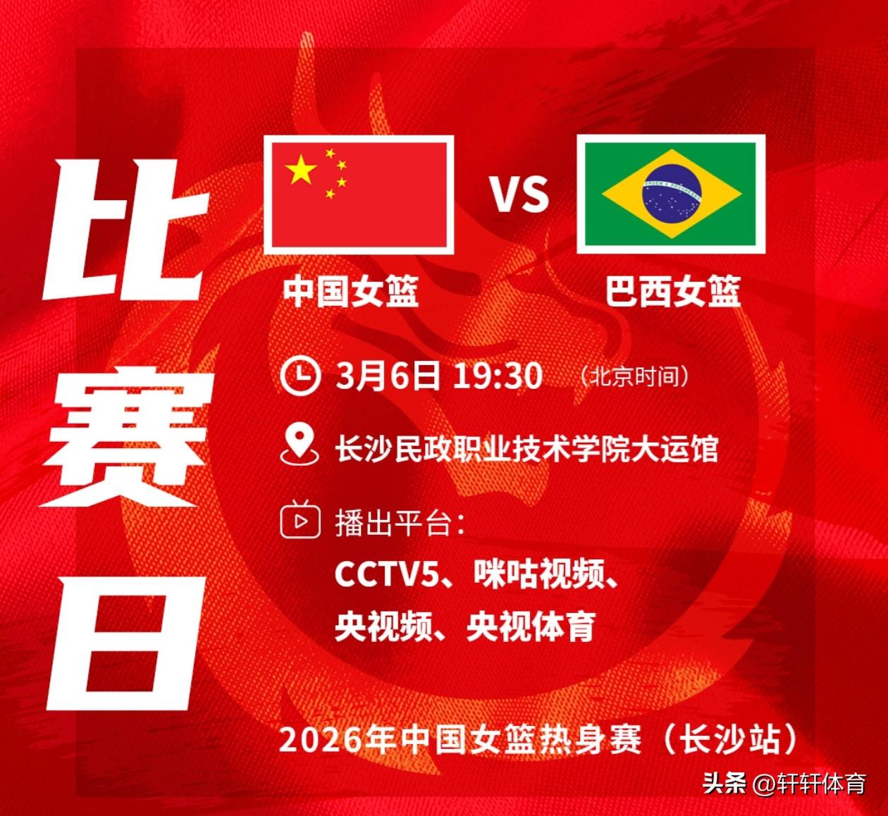 中国女篮热身赛第二场,3月6日19点30分继续在长沙上演,对手仍然是巴西女篮,首回合中国女篮经过加时赛以74-69艰难战胜巴西女篮,中国女篮在整场比赛都处于领先的优势下,比赛末节最后时刻,被巴西女篮以一记超远三分将比分扳平,加时赛阶段中国女篮大将王思雨顶住压力,带领中国女篮拿下首场胜利,今天的二番战相信双方都会拿出更高的专注度来面对本场比赛,毕竟世预赛武汉赛区两队还要真刀真枪的比赛,相信中国女篮经过几天的调整今天的比赛不会再出现上一场的失误了。
