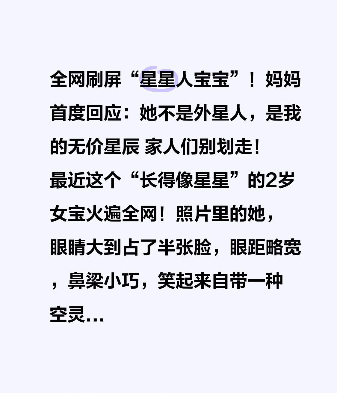 全网刷屏“星星人宝宝”!妈妈首度回应:她不是外星人,是我的无价星辰 家人们别划走!最近这个“长得像星星”的2岁女宝火遍全网!照片里的她,眼睛大到占了半张脸,眼距略宽,鼻梁小巧,笑起来自带一种空灵的“外星萌感”,被网友亲切叫“星星人”。有人好奇追问“是不是混血”,还有人偷偷私信质疑“孩子是不是有问题”,昨天,妈妈一条视频含泪回应,直接反转了所有人的看法,看完心里又暖又酸! 事情要从一周前说起,妈妈随手发了女儿小星日常玩耍的视频,原本只是记录成长,没想到一夜爆火。评论区里,一半人被小星的颜值征服:“这是从银河里偷跑出来的小天使吧”“眼睛里像装了整片星空”;另一半人却带着顾虑,有人猜测“父母是不是有异域血统”,还有人隐晦地问“孩子是不是得了什么病,要不要去检查”。 看着越来越多的猜测,妈妈既无奈又心疼,转折点就藏在她的这条回应视频里。她没有回避质疑,反而坦然晒出了一家三口的合照——爸爸是山东大汉,妈妈是江南姑娘,妥妥的本土组合,彻底打破了“混血传闻”。紧接着,妈妈拿出了小星的全套体检报告,白纸黑字写着:孩子各项发育指标正常,智力、视力、运动能力全都达标,所谓的“星星长相”,只是天生的面部特征,是独属于她的“出厂设置”。 妈妈还分享了一个暖心细节:小星虽然才2岁,却格外懂事。听到有人说她“长得奇怪”,她会轻轻摸着妈妈的脸说“我是妈妈的小星星”。为了保护女儿,妈妈关掉了评论区的恶意留言,却保留了所有温暖的祝福,她笑着说:“我不在乎别人怎么看,在我眼里,她不是什么‘星星人’,是我拼尽全力守护的无价星辰。” 这条回应发出后,全网瞬间破防。网友们纷纷道歉并送上祝福:“原来独特也是一种美”“每个孩子都是独一无二的天使”“妈妈的爱,就是孩子最硬的铠甲”。还有很多有相似经历的家长留言,说自己的孩子也有与众不同的长相,看完这条视频,终于敢大方晒出孩子的照片了。 其实,每个孩子都是上帝咬过的苹果,有的格外甜美,有的带着独特的印记。我们总习惯用“标准”去衡量美,却忘了独一无二的模样,才是生命最珍贵的礼物。小星的“星星脸”,不是缺陷,而是她区别于所有人的标志;妈妈的坦然与守护,更是给所有家长上了生动的一课。 愿每个与众不同的孩子,都能被世界温柔以待;愿每一位父母,都能成为孩子最坚实的后盾。不用活成别人眼中的“标准答案”,勇敢做自己,就是最美的模样。为这位通透又坚强的妈妈点赞,也祝小星永远做一颗快乐闪耀的小星星!