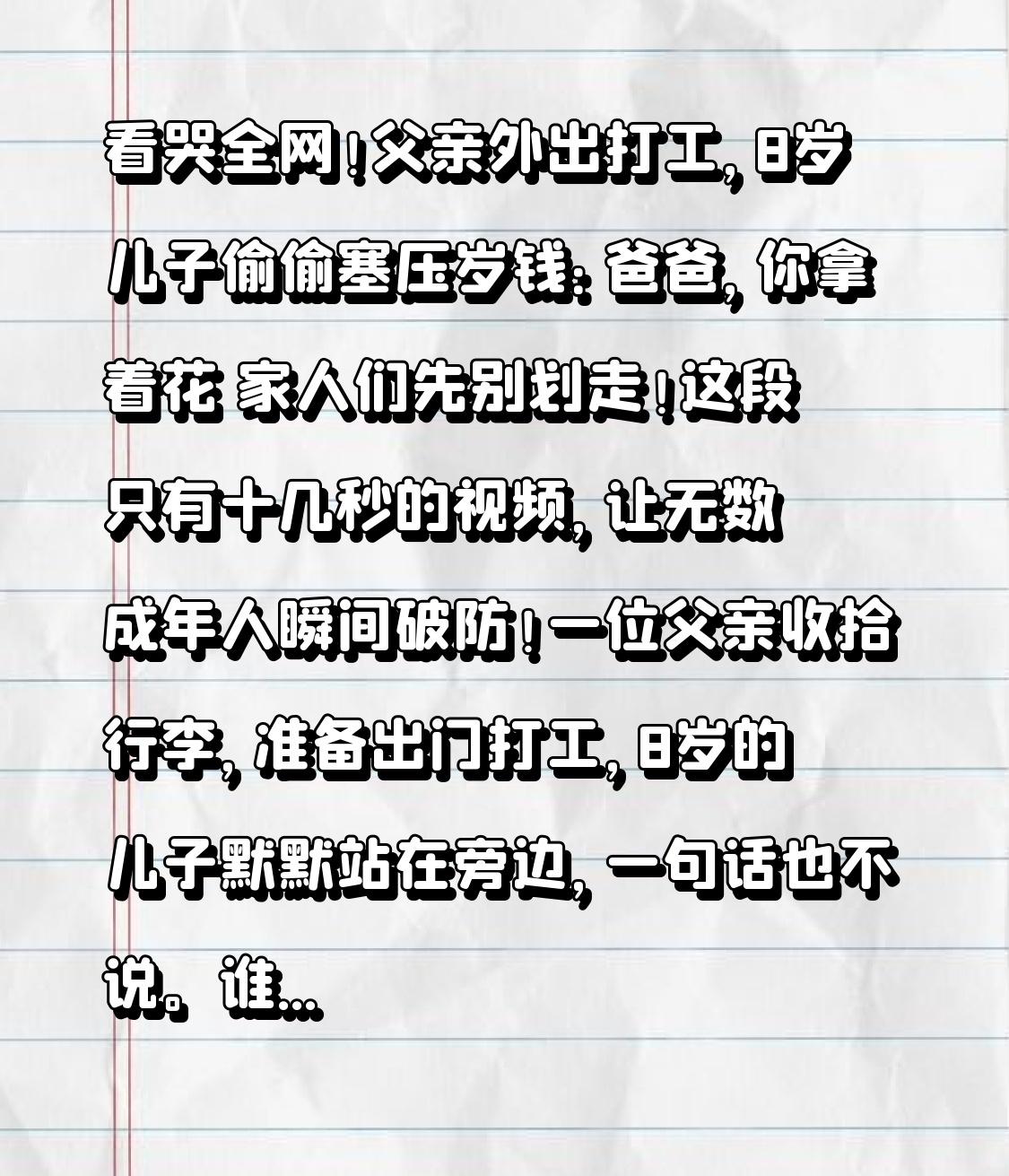看哭全网!父亲外出打工,8岁儿子偷偷塞压岁钱:爸爸,你拿着花 家人们先别划走!这段只有十几秒的视频,让无数成年人瞬间破防!一位父亲收拾行李,准备出门打工,8岁的儿子默默站在旁边,一句话也不说。谁也没想到,下一秒,孩子做出的举动,让爸爸当场红了眼眶! 父亲常年在外打工,一年到头回不了几次家,每次分别,都是最难受的时候。这天一大早,爸爸把行李打包好,就要坐车离开。孩子一直跟在身后,眼神里全是不舍,小手紧紧攥着什么东西,一直没敢拿出来。 就在爸爸转身要走的那一刻,转折点来了! 8岁儿子突然冲上前,把一叠整整齐齐的压岁钱,狠狠塞进爸爸口袋里,仰着小脸认真说:爸爸,你拿着花,在外面别太累了! 爸爸当场愣住,连忙推辞:“爸爸有钱,你留着买零食买玩具。” 可孩子死死按住爸爸的手,带着哭腔说:“我不用,你在外面打工辛苦,你花!” 这一幕被妈妈拍下来发到网上,瞬间刷屏,评论区全是泪目。 有人说:“孩子的压岁钱,是他全部的财富,他却毫不犹豫给了爸爸。” 有人说:“最穷不过要饭,不死总会出头,为了孩子,再苦再累都值。” 还有人说:“我也是在外打工的父亲,看完不敢再看第二遍,太戳心了。” 其实孩子什么都懂。他知道爸爸背井离乡是为了养家,知道爸爸在外省吃俭用,知道自己帮不上大忙,只能把最珍贵的压岁钱,全部给最爱的爸爸。 小小的身影,藏着最纯粹的爱;薄薄的钞票,装着沉甸甸的心疼。 我们总在为生活奔波,为柴米油盐发愁,却常常忽略,孩子最想要的不是多少钱,而是陪伴;父母最牵挂的,不是赚多赚少,而是家人平安。 父爱如山,子孝暖心。这一幕,是无数打工人家庭的真实写照。 为了生活,我们背井离乡;为了家人,我们咬牙坚持。可只要有这份爱,再远的路、再难的日子,都能扛过去。 愿所有在外打拼的父母,平安顺利、早归故里; 愿所有懂事的孩子,被时光温柔以待,健康快乐长大; 更愿每一个平凡的家庭,都能团圆常在,幸福安康! 如果你也被这对父子打动,点赞转发,把这份温暖传递下去!