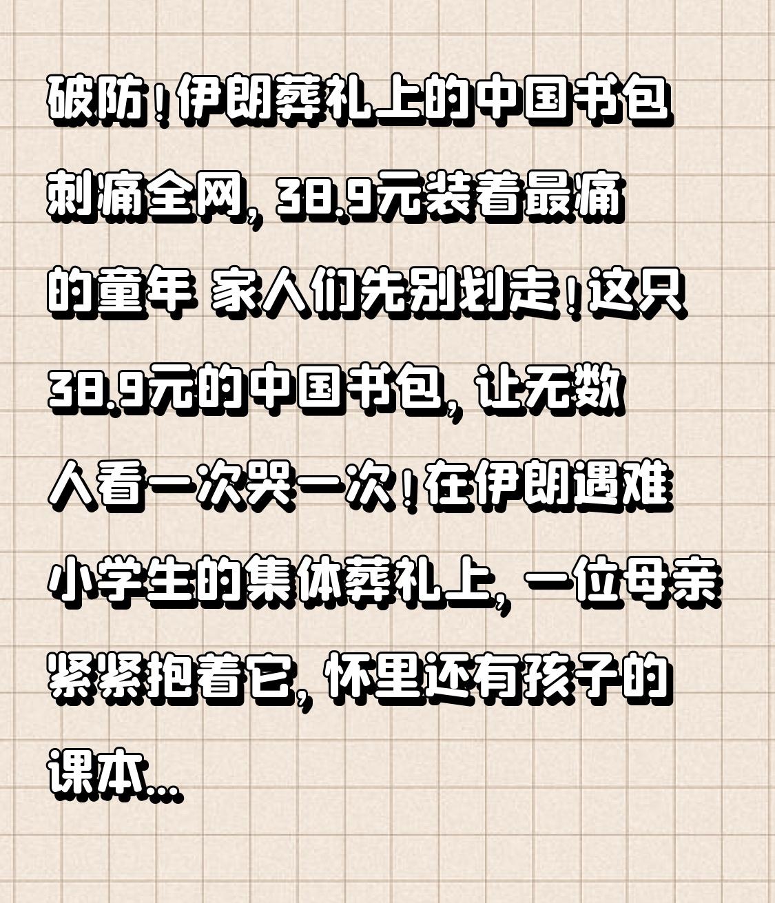 破防!伊朗葬礼上的中国书包刺痛全网,38.9元装着最痛的童年 家人们先别划走!这只38.9元的中国书包,让无数人看一次哭一次!在伊朗遇难小学生的集体葬礼上,一位母亲紧紧抱着它,怀里还有孩子的课本与照片,撕心裂肺的哭声,隔着屏幕都让人揪心。这只印着拼音logo的普通书包,为何成了全世界最心碎的符号? 2月28日,美以联合空袭击中伊朗南部米纳卜市一所女子小学,165名7-12岁的小女孩永远停在了课堂里。3月3日集体葬礼上,165口覆盖伊朗国旗的小棺椁排成一排,小小的墓穴一眼望不到头。这位母亲怀里的书包,是孩子生前最宝贝的东西,崭新的布料、可爱的图案,本该装满课本、橡皮与梦想,如今却成了遗物,沾满灰尘与泪痕。 转折点来了! 网友一眼认出书包上的拼音,在国内电商平台轻松找到同款,售价仅38.9元,商品详情页写着温暖的标语:缤纷童年,活力满满。在中国,它是孩子开学的普通礼物,是上学路上的日常陪伴;在战火中的伊朗,它却成了生命消逝的见证,成了母亲再也唤不回的女儿。 同样的书包,两种截然不同的命运。我们的孩子背着它嬉笑打闹,担心作业太多、零食太少;伊朗的孩子背着它走进校园,却再也没能回家。商品评论里全是“孩子喜欢”“结实耐用”的日常烟火气,可这些平凡的幸福,对伊朗父母来说,却是遥不可及的奢望。 中方已强烈谴责袭击学校的暴行,明确指出儿童不是目标,学校不是战场。可再多的谴责,也换不回165条鲜活的小生命,缝不好破碎的家庭,擦不干母亲的眼泪。 这只中国书包告诉我们:和平从不是理所当然。我们能安心送孩子上学、能享受平凡日常,是因为生在没有战火的国度。战争从不分年龄,炮火从不懂温柔,霸权与冲突毁掉的,是无数个本该闪闪发光的童年。 愿硝烟早日散去,愿学校不再是袭击目标,愿每个孩子都能背着书包平安长大。这只38.9元的书包,装的不是玩具,是全人类对和平最朴素的期盼。 如果你也被刺痛,请点赞转发,为伊朗孩子祈福,愿世界再无战火!